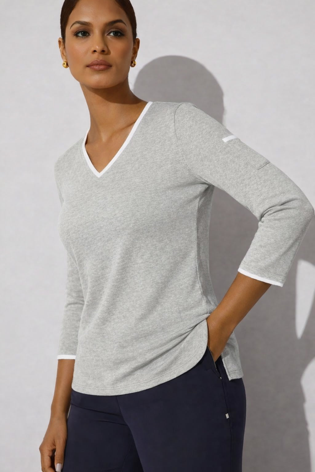 Made in our soft yarn blend, the Southampton V-Neck marries classic silhouette with subtle trim details. It features a V-neck and contrasted trim on the collar and cuffs. It's complete with a small pocket on the arm, 3/4 sleeves, and a raw-edge hem. A classic tunic with understated sophistication and detail. Perfect for layering or worn solo, for sunny afternoon activities. Classic and coastal, with vibrant hues.• Care Instructions: Machine wash cold, Only non-chlorine bleach when needed, Tumble dry low, Cool iron OR Professional dry clean.• Fabric Content: 94% Pima Cotton / 4% Spandex• Country of Origin: Peru