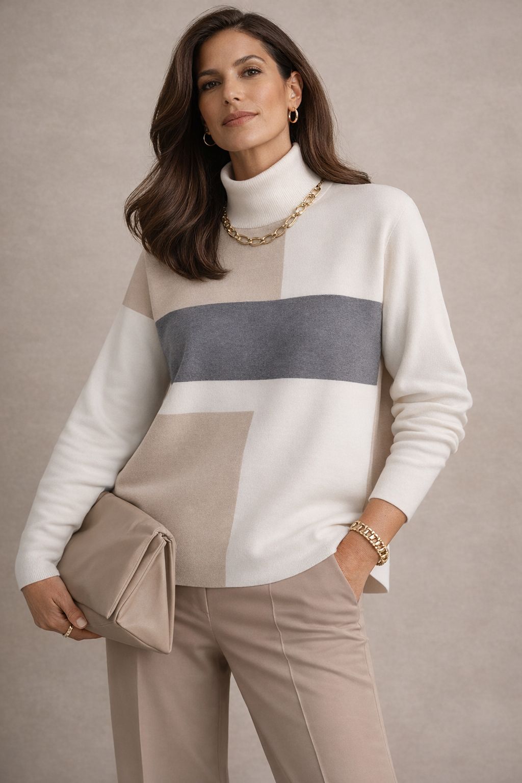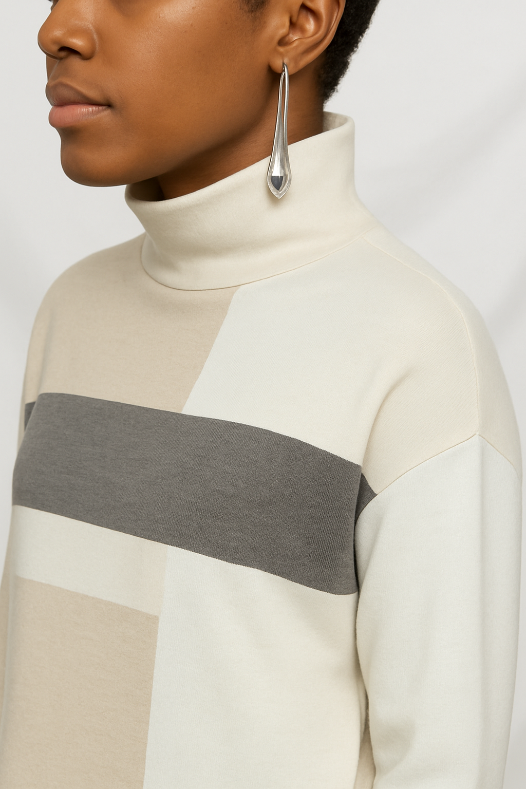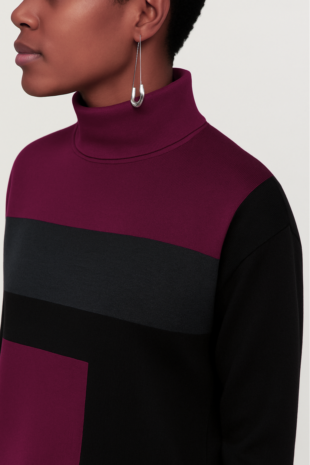 Crafted in our Stolen Softness™️ Proprietary beloved yarn blend, The Zurich Colorblock Sweater offers warmth and quiet structure with a relaxed, easy shape. The mock neckline provides a clean, modern frame, while color blocking in deep colorways adds depth and visual interest. It's ideal for cooler days and layered dressing. It pairs perfectly with tailored trousers for office meetings, or layered with a coat for snowy alpine getaways. A moody palette, effortless fit, and softly sculpted silhouette make this a go-to piece for winter and beyond.