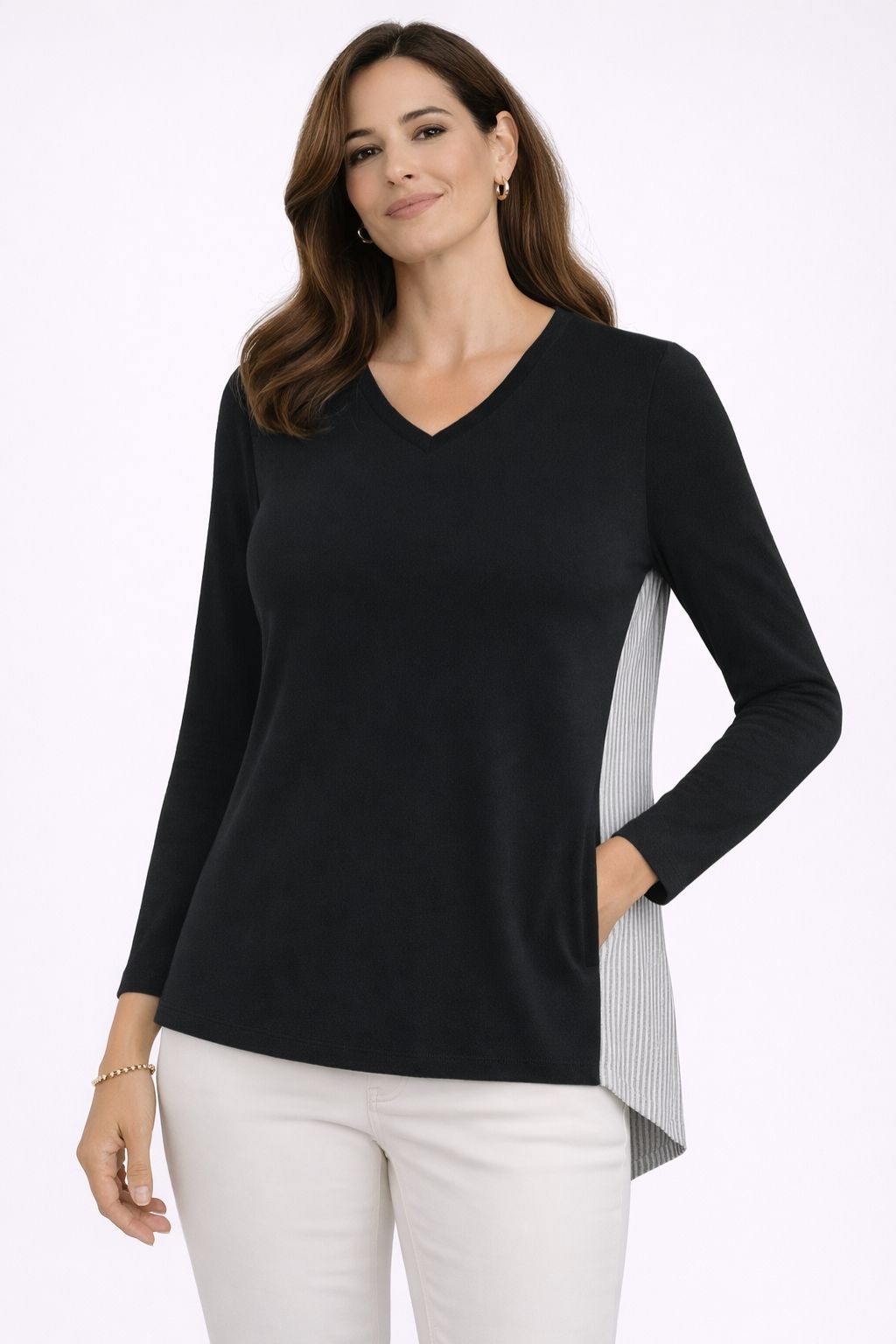 The Arles V-Neck pairs soft structure with unexpected detail. The front is crafted in our soft yarn blend with a clean V-neckline and long sleeves, while the back reveals a lightweight panel in a delicate vertical stripe—adding subtle contrast and movement. Refined yet relaxed, it's the kind of piece that transitions seamlessly from city to coast, for relaxed dinners on the pier to sophisticated work meetings.