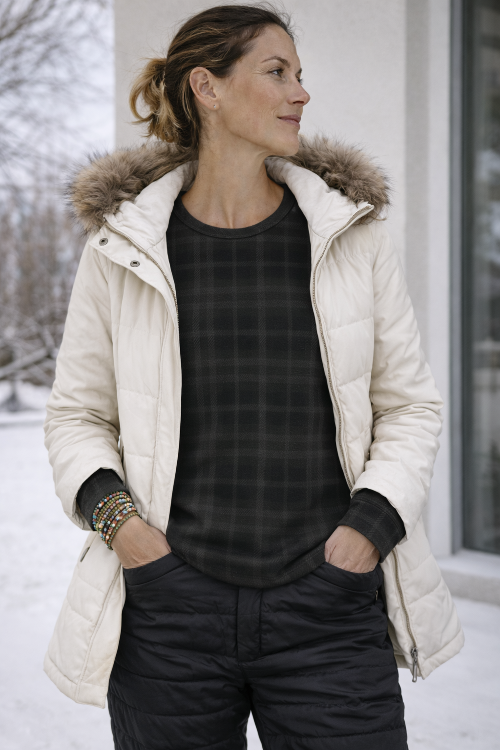 The Rothenburg Plaid Long Sleeve marries classic plaid texture with subtle, contemporary details. Made from our soft yarn blend with a faint plaid pattern, it features a crew neckline and refined silhouette—offering warmth and structure. It's complete with ruched long sleeves that add a touch of movement and understated sophistication. Perfect for layering or worn solo, for crisp days outdoors.
