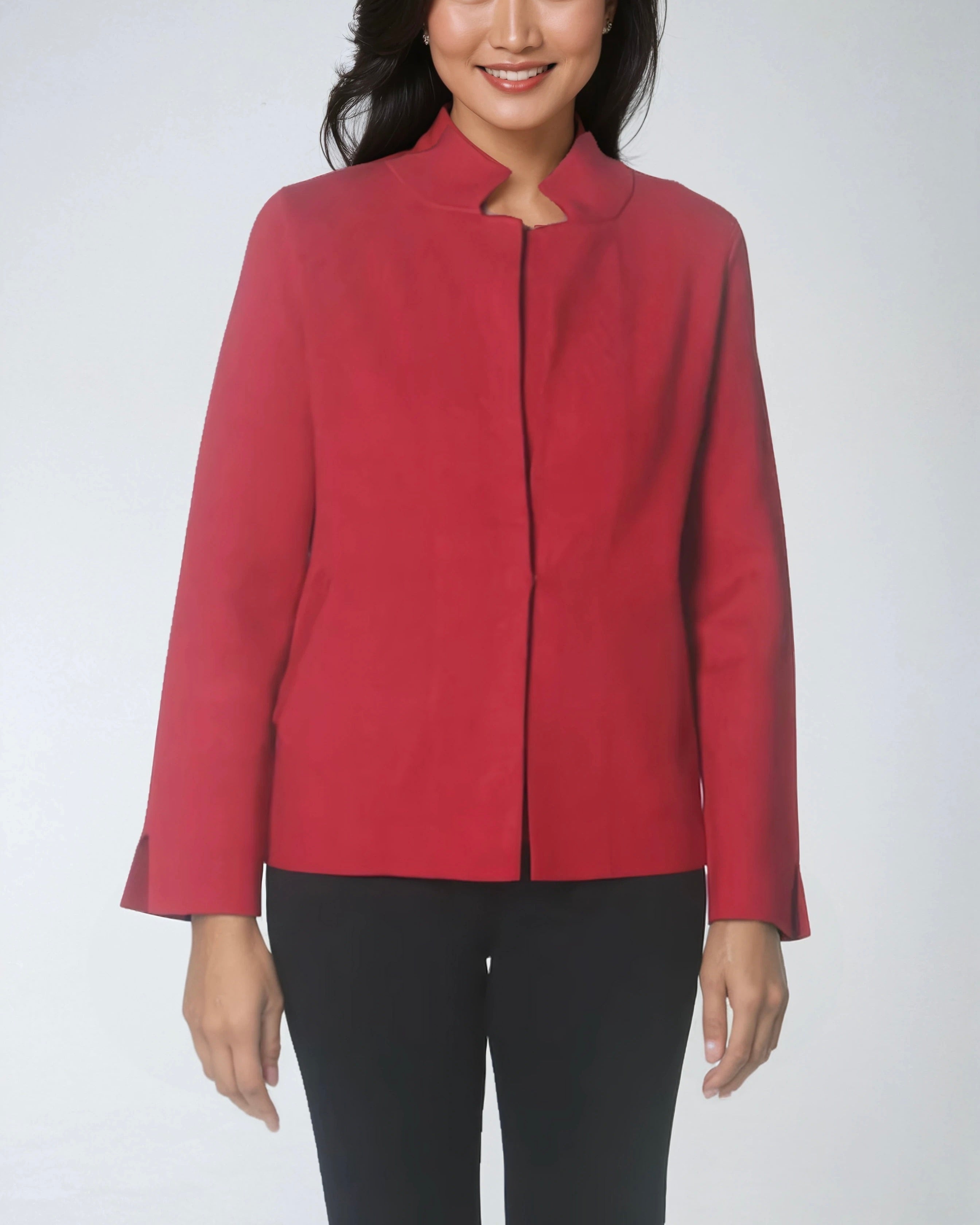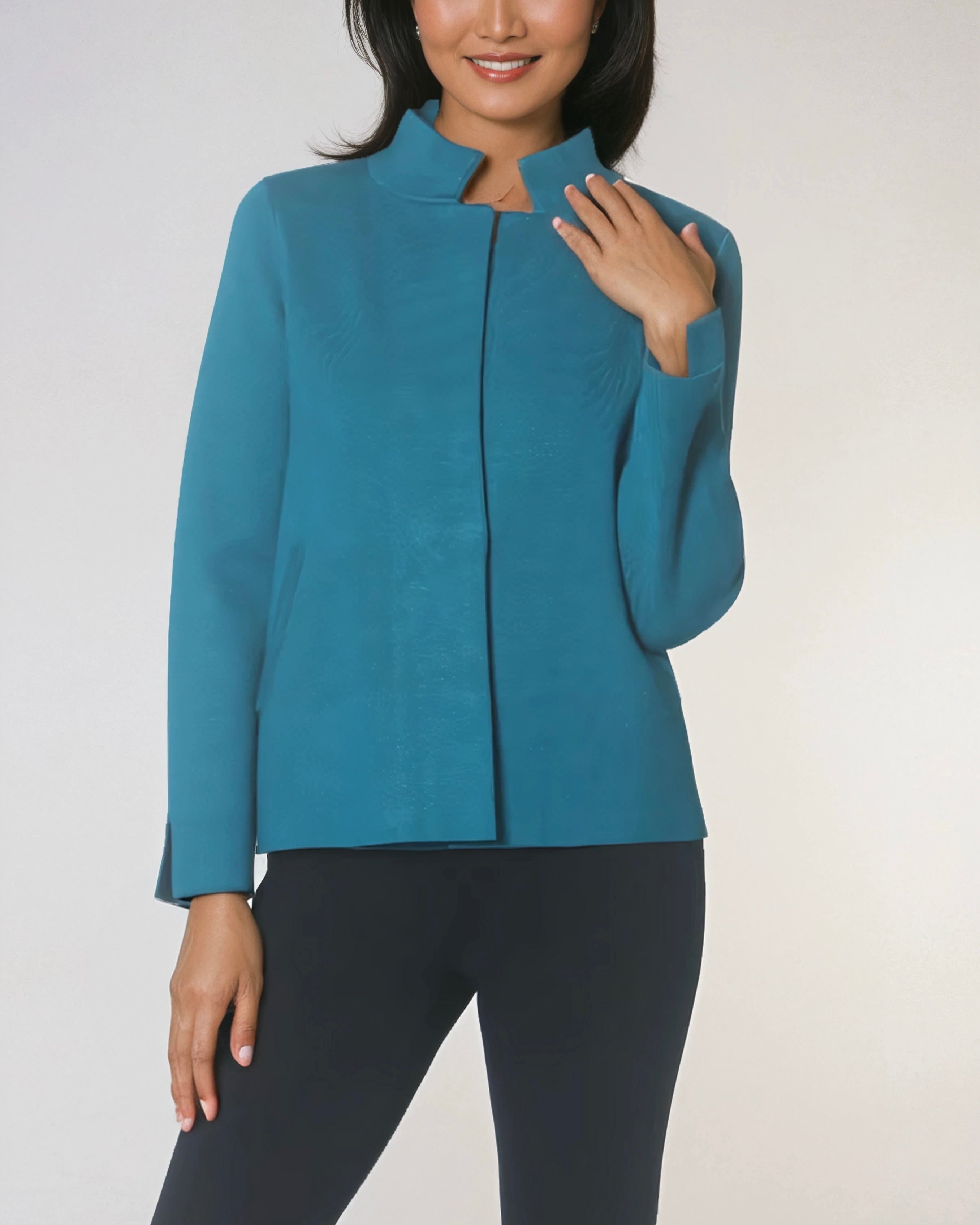Tailored in our Stolen Softness™️ Proprietary beloved yarn blend, the Windsor Soft Collar Jacket blends refined structure with tailored edge. Designed with a structure silhouette, it features full-length sleeves, a clean front, and soft shaping at the collar for an elevated, yet poised look. With its electic colorways like Claret or Teal, it's equally suited for layering or styling as a standalone statement, for brisk getaways in the Hamptons or shopping days in the city. An elevated style with artistic flair.