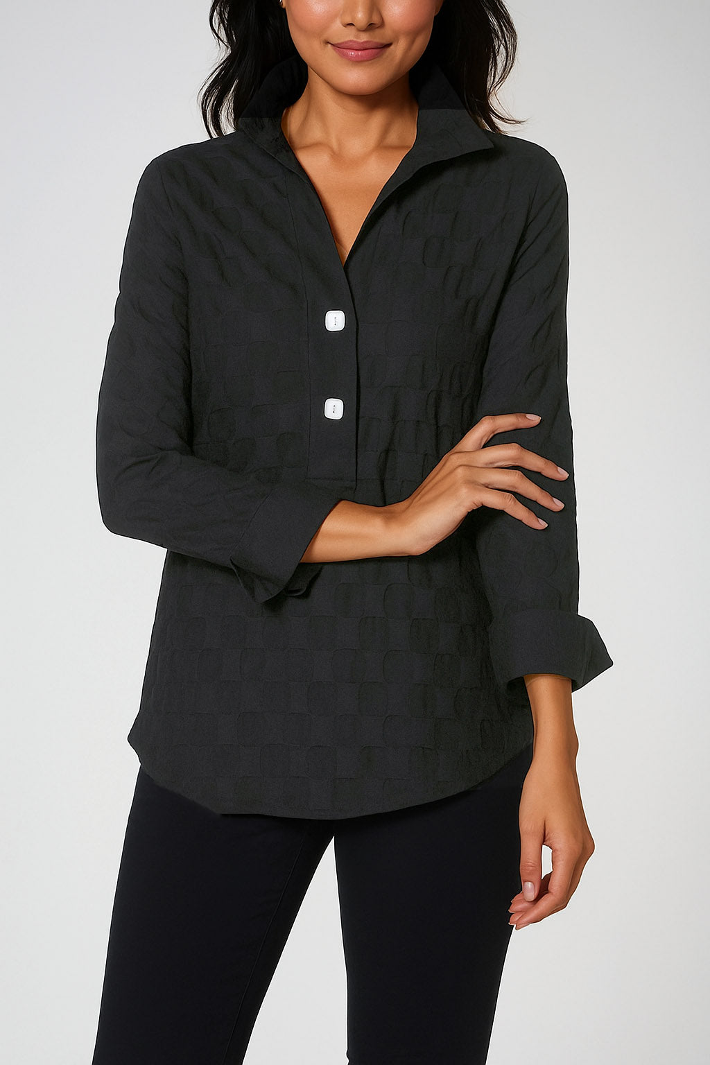 Light, structured, and quietly textural, The Gaia Henley Top brings a coastal cool to the classic Henley. Crafted in our signature 'Bamboo' fabric, with a repeated square motif, it offers subtle depth while maintaining an airy, polished look. The bias-cut sleeves add fluidity and ease, while the Henley buttons front keep things clean and refined. Whether styled with soft trousers or worn open over a tank, it's a refined essential that feels right at home by the sea—or anywhere your day takes you. A structured take on a relaxed, coastal style.