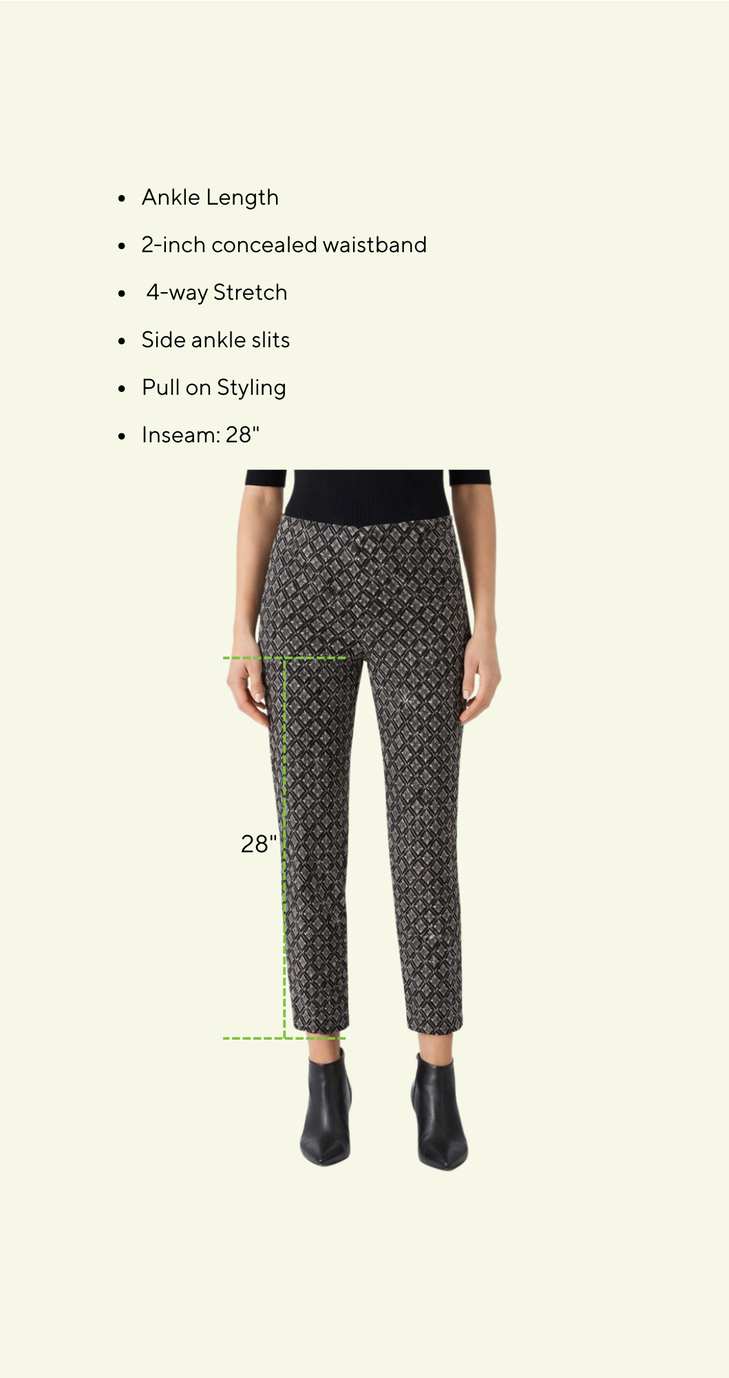 The Lugo Ankle Pant offers a modern twist on a classic silhouette. Featuring an abstract print, ankle-length cut, pull-on waistband, and ankle slits, they combine edgy detail with effortless style. Perfect for pairing with a chunky sweater or sleek blazer, it adds a sleek finish to both casual and polished looks. These pants bring contemporary sophistication to your wardrobe.