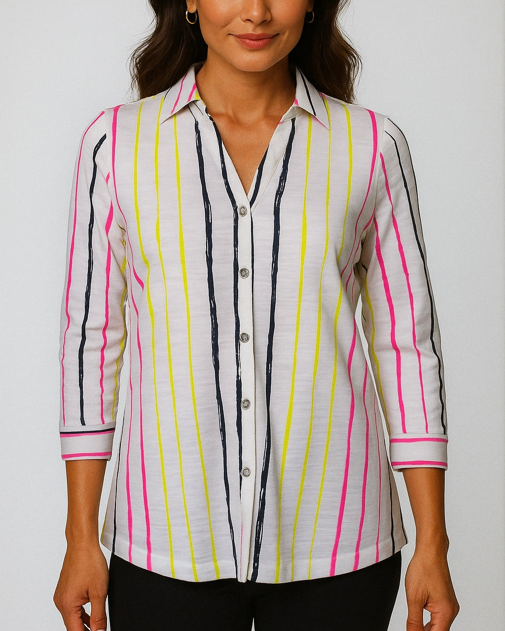 The Sami Button Down brings color and ease to sunlit days. Crafted with a tailored collar, front button closure, and elbow-length sleeves finished with a crisp folded cuff, it blends structure with a carefree spirit. The vertical multi colored stripes in Black, Pink, and Yellow compliment the sleek White silhouette. Perfect for morning strolls to days near the shore, with it's vivid hues and relaxed fit.