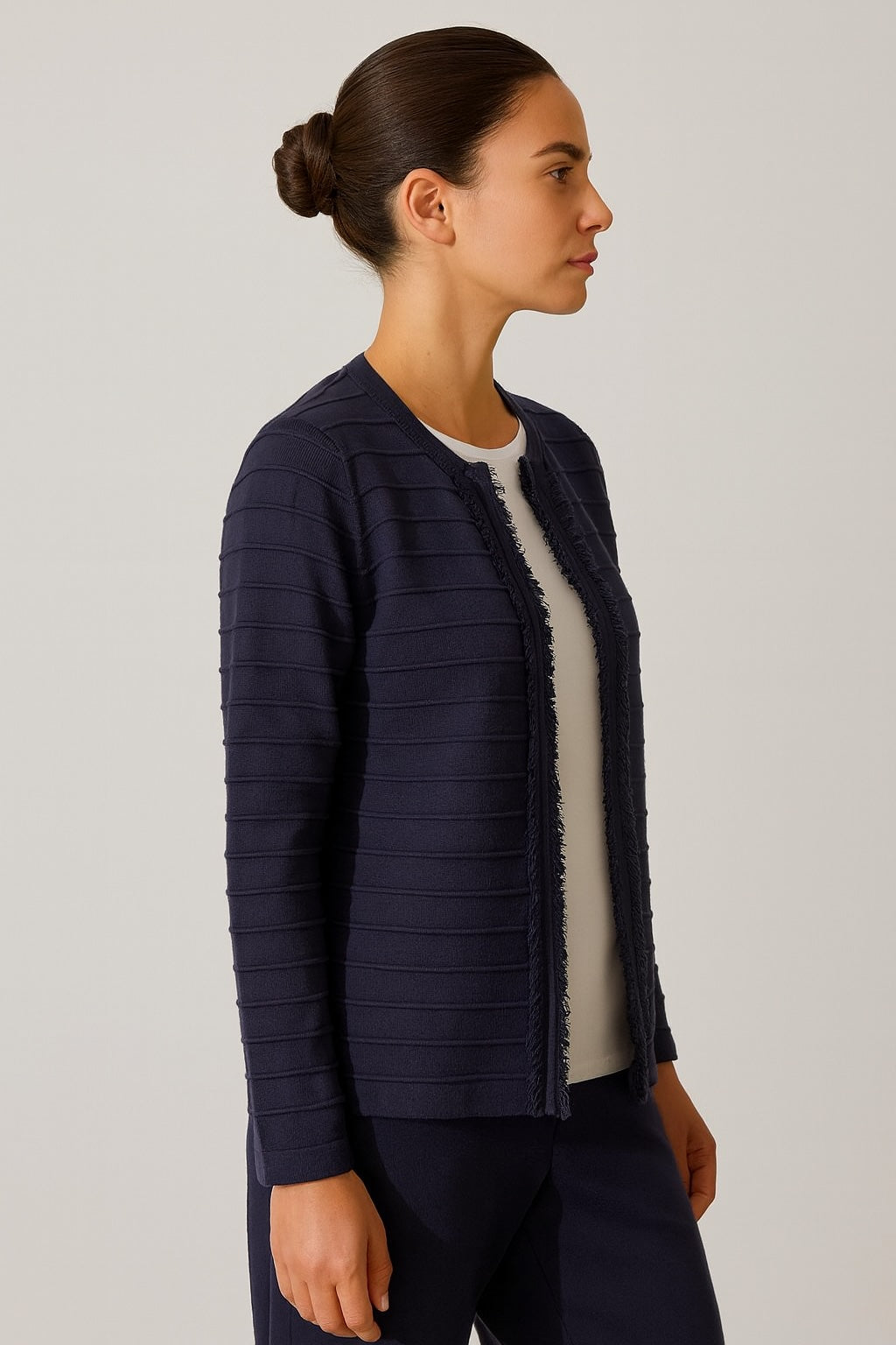 With its textured finish and expressive fringe details, The Chania Fringe Jacket brings a bold coastal spirit to classic tailoring. Designed in our Stolen Softness™️ Proprietary beloved yarn blend, this piece makes a statement through movement and dimension—thanks to its horizontal stripe texture. It's complete with a center front zipper closure, decorated with a fringe trim. Whether worn over crisp shirting or a simple knit, the jacket adds instant personality and polish. Effortlessly striking, it's a modern layer perfect for breezy strolls on the pier. A vibrant, playful take on a refined style.