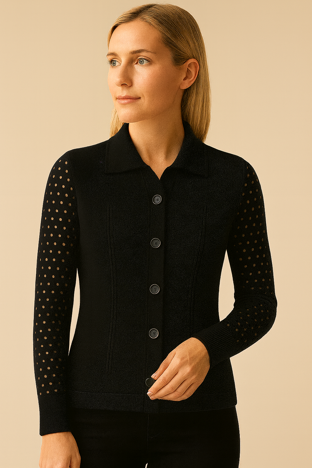 Created in our Stolen Softness™️ Proprietary beloved yarn blend, the Málaga Eyelet Sleeve Jacket is effortlessly structured with a modern twist. While it has a sleek bodice, the sleeves are decorated with a eyelet fabric. Designed with a classic fold-over collar and button closure, this layer offers an elevated twist on a typical jacket. Available in Sand, Black, or White, it is the perfect item to wear as a statement piece or layered over any knit. A stylish choice for walks in the park or paired with denim to shop in the market.