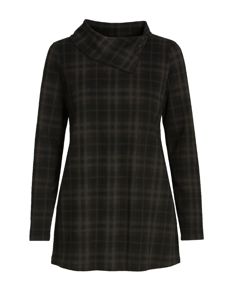 The Dunmore Top, knit in our soft yarn blend, features a faint plaid pattern woven into its base, available in a Black colorway. The fold-over turtleneck, fastened with understated buttons, adds warmth and structure without weight. Finished with long sleeves and a streamlined silhouette, it's perfect for pairing with denim for chilly shopping trips in the city. Cozy and refined.• Care Instructions: Machine wash cold, Only non-chlorine bleach when needed, Tumble dry low, Cool iron OR Professional dry clean.• Fabric Content: 94% Pima Cotton / 4% Spandex• Country of Origin: Peru
