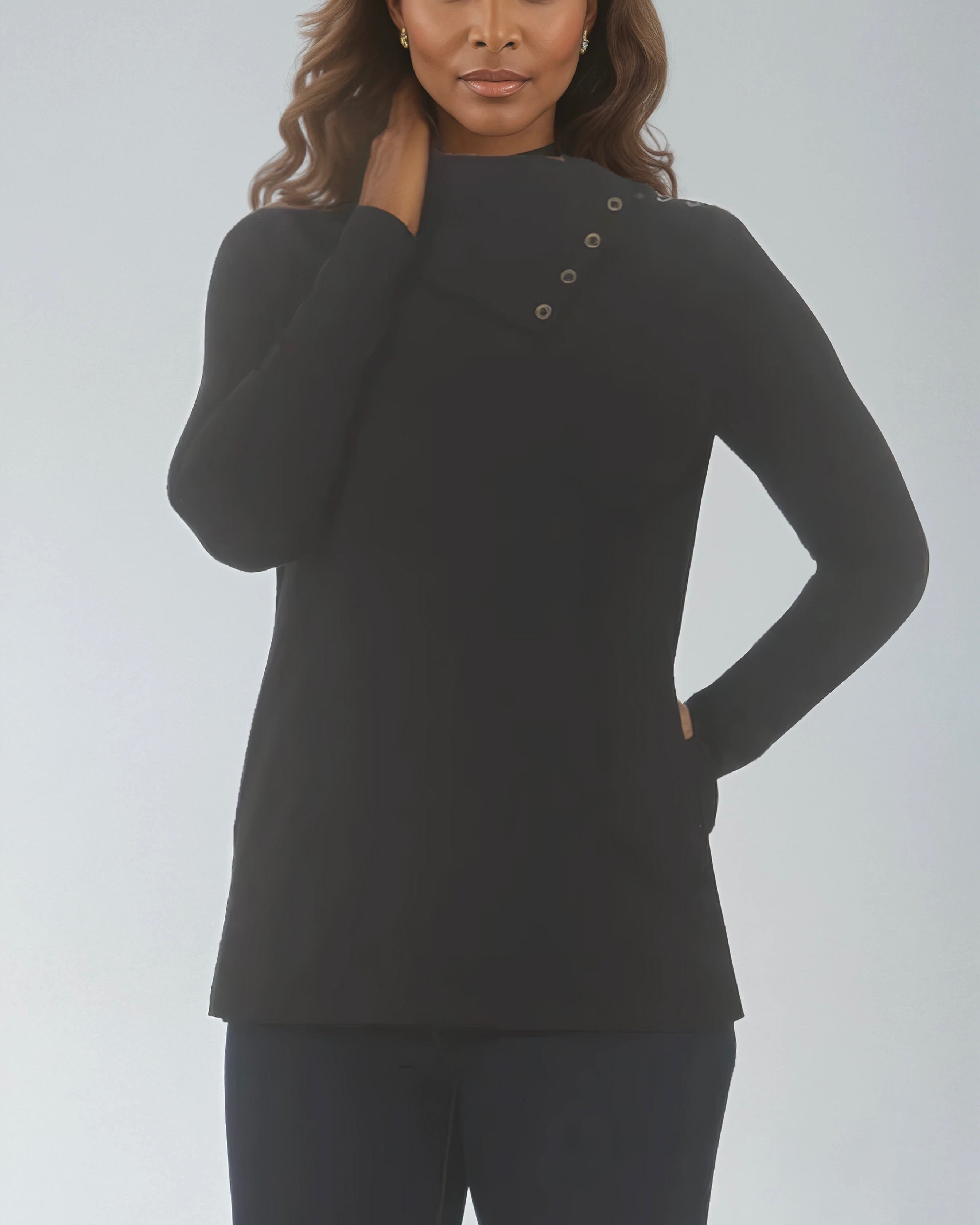 The Kinsale Fold-Over Turtleneck, knit in our soft yarn blend, features a sleek and cozy long sleeve, available in a Black colorway. The fold-over turtleneck, fastened with understated buttons, adds warmth and texture. It's a versatile layer with to perfectly paired with denim and loafers for early office meetings to chilly walks through the park. Cozy, comforting, and refined.
