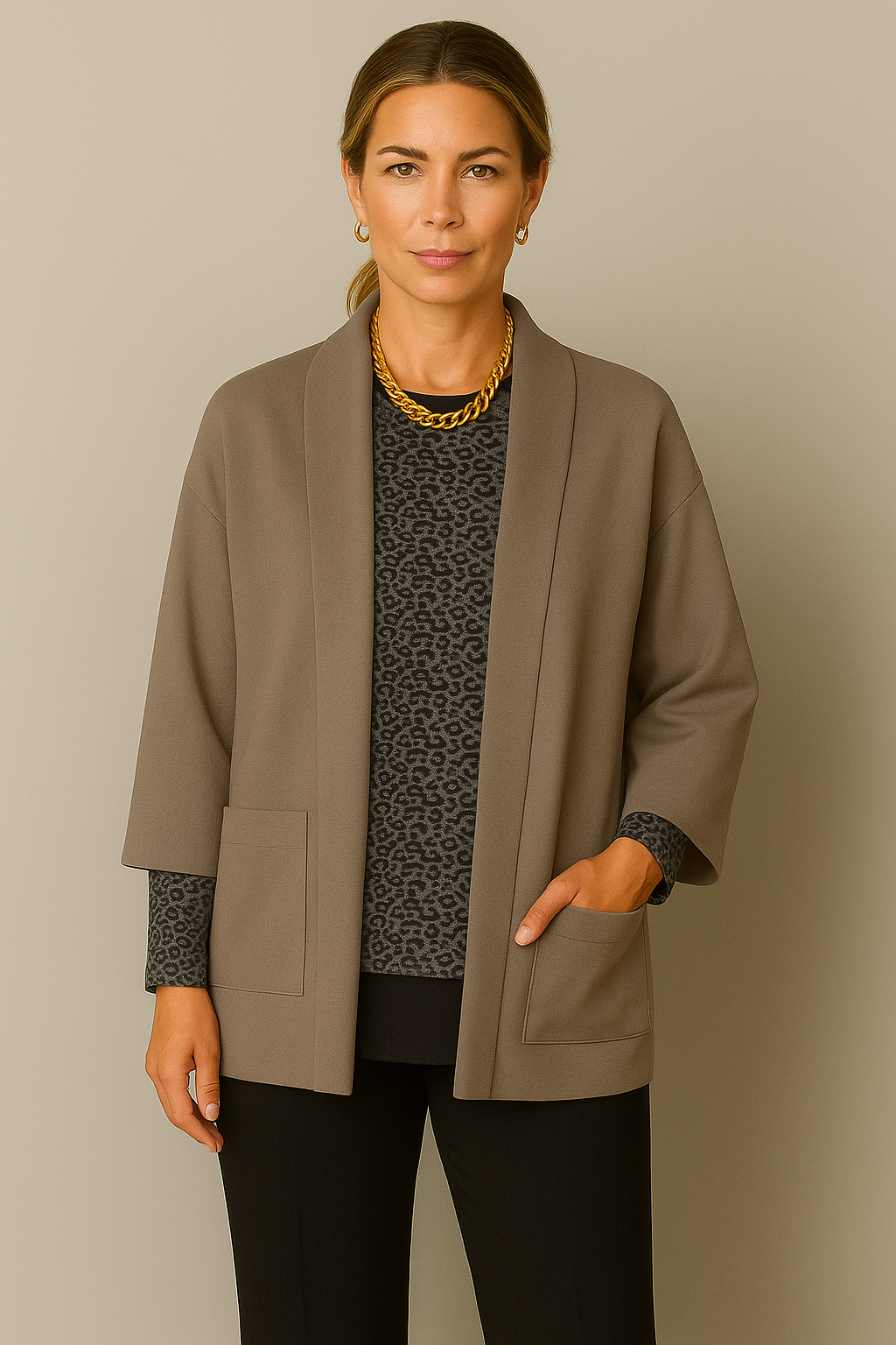Subtle statement, timeless edge—the Paloma Printed Long Sleeve blends boldness with restraint. Crafted in our soft yarn blend, its fine, repeating leopard motif offers texture and intrigue without overwhelming. The sleek black trim at the crew neckline, cuffs, and hem adds structure and contrast, grounding the print with polished intention. Fitted through the body with an easy stretch, it's a versatile piece that layers beautifully and stands confidently on its own. Wild, but never loud -- perfect for pairing with trousers for office meetings, or a skirt and heels for dinner dates. A moody, yet subtle piece.