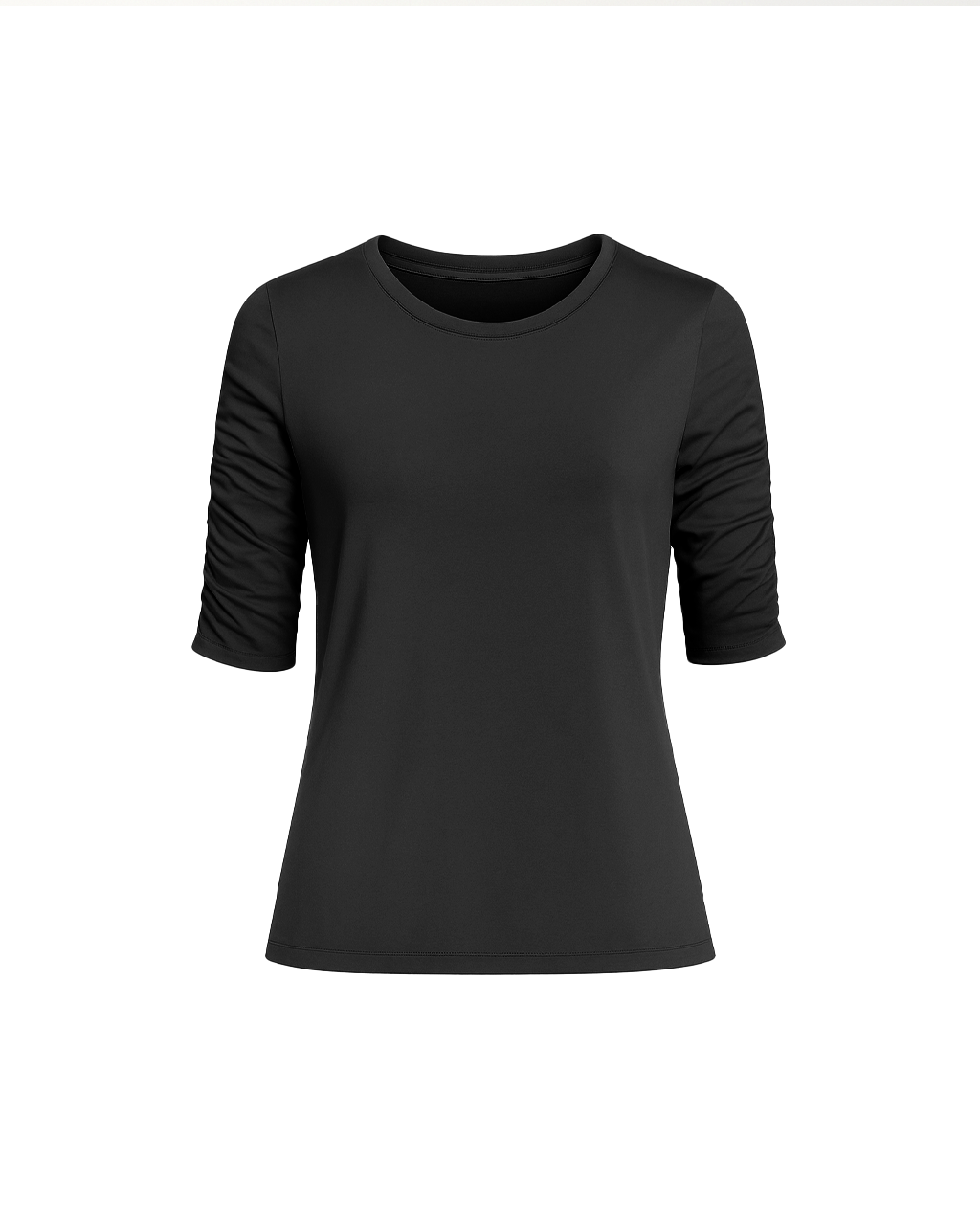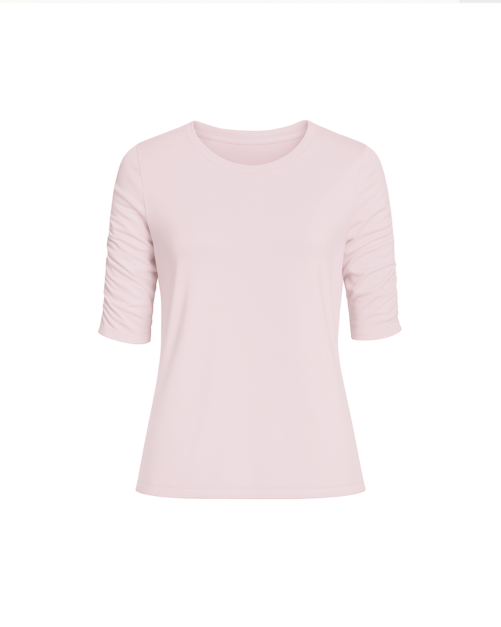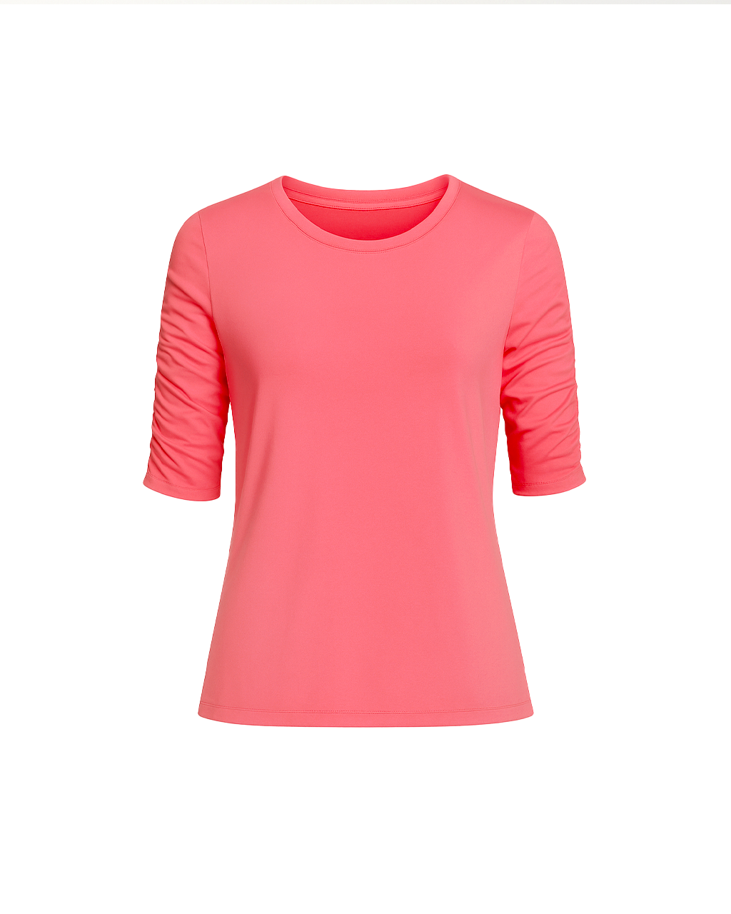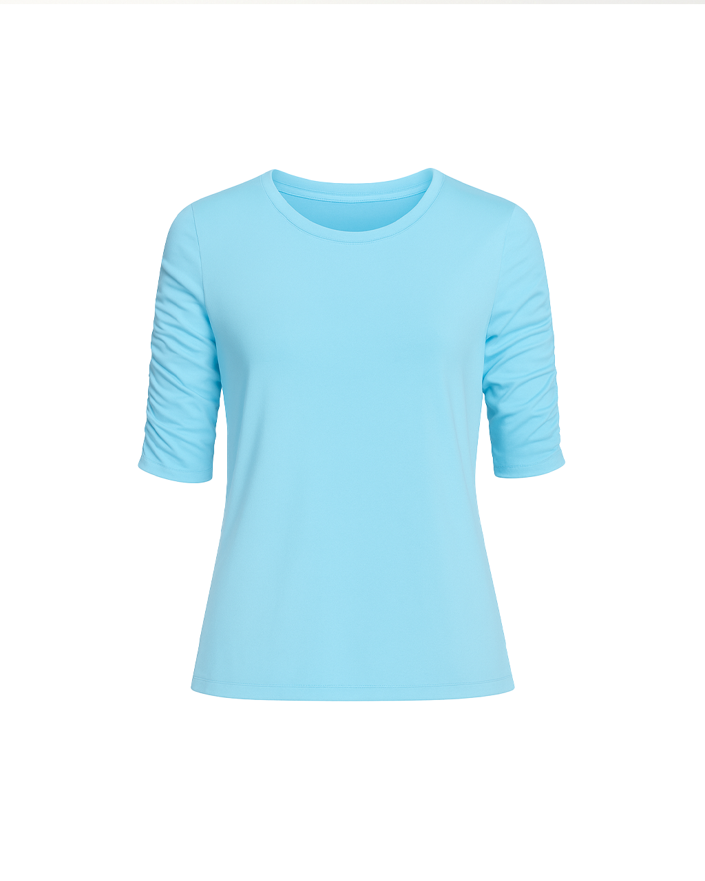 Crafted in a light breathable fabric, the Isla Ruched Sleeve Top is a relaxed-fit essential in vibrant Blossom or serene Turquoise. Also available in Black or White, Its soft, breathable fabric drapes gently over the body, while the ruched elbow sleeves add a touch of playful texture and subtle volume. The classic crew neckline balances the design with clean simplicity, making this top perfect for sun-soaked days or casual evenings by the sea. A classic style with a coastal vibe.