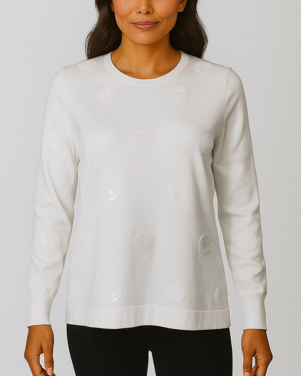Balancing ease with polish, The Cannes Sequin Top features a body-skimming fit that flatters without feeling tight. The long sleeves and crew neckline keep the silhouette clean, while the printed sequin motif adds a touch of shimmer—delivering all the sparkle, none of the fuss. Crafted in our Stolen Softness™️ Proprietary beloved yarn blend, it is lightweight and versatile, moving easily from day to night. It offers subtle shine under a blazer or worn solo for an understated statement.
