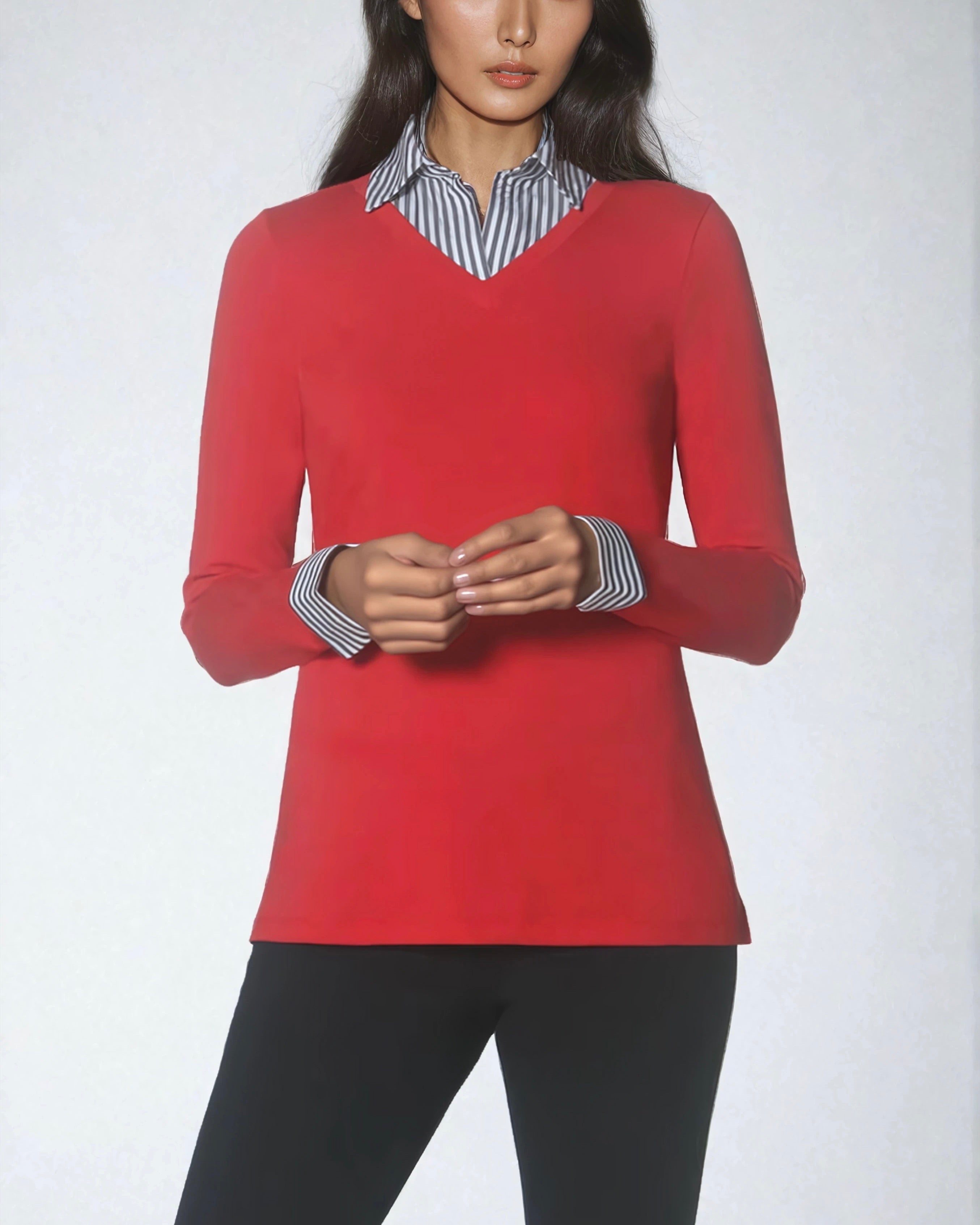 The Oxford Collared Top, spun in our soft yarn blend, features a fitted long sleeve with a V-neckline. Layered underneath is a polished woven button up with a pointed collar and cuffs. Completed with a striped print, this top is available in Red or Blue, making it a perfectly poised piece for office meetings or work dinners. Smart and refined for any occasion. Crisp, tailored and refined.• Care Instructions: Machine wash cold, Only non-chlorine bleach when needed, Tumble dry low, Cool iron OR Professional dry clean.• Fabric Content: 96% Pima Cotton / 4% Spandex• Country of Origin: Peru