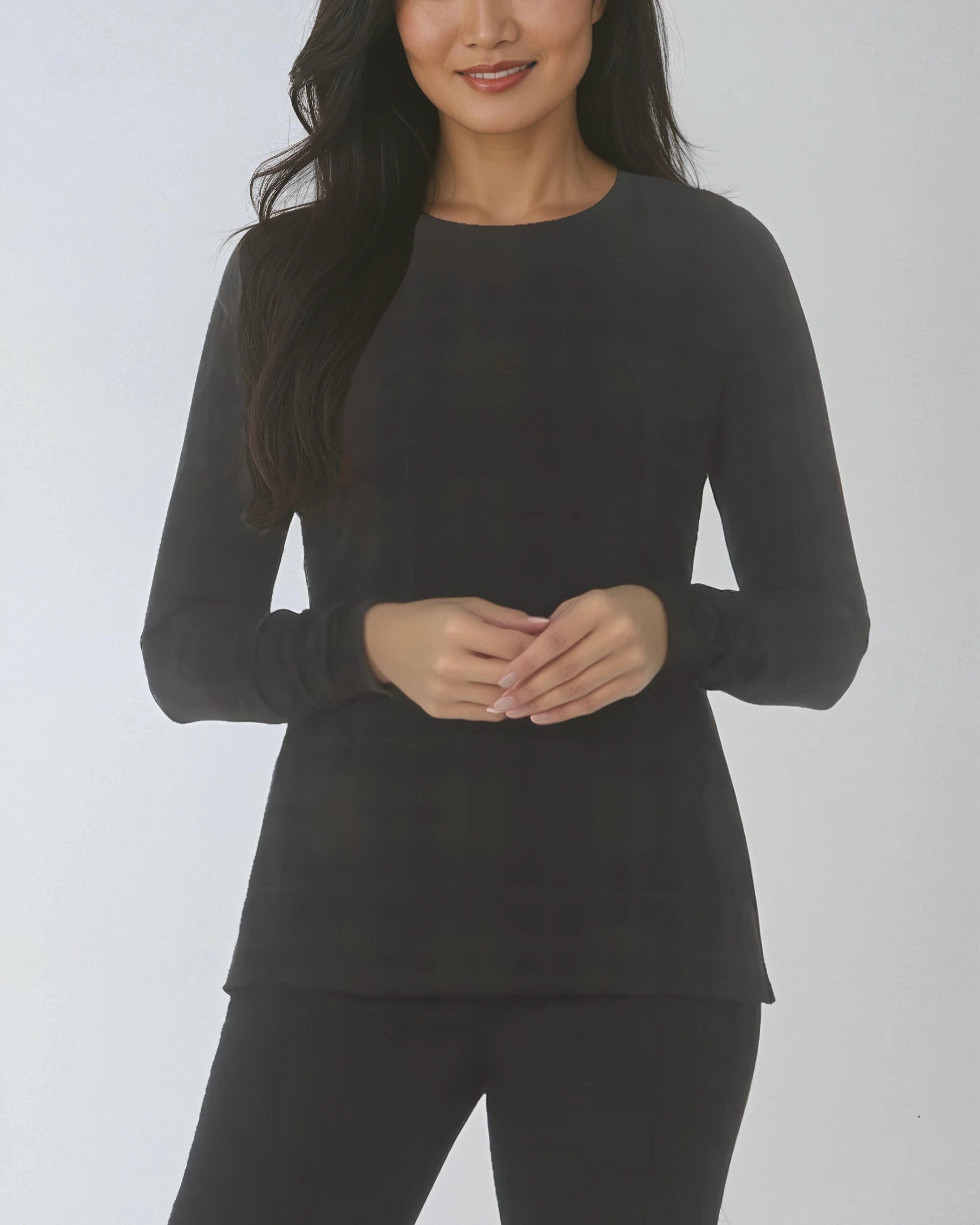 The Rothenburg Plaid Long Sleeve marries classic plaid texture with subtle, contemporary details. Made from our soft yarn blend in Black with a faint plaid pattern, it features a crew neckline and refined silhouette—offering warmth and structure. It's complete with ruched long sleeves add a touch of movement and understated sophistication. Perfect for layering or worn solo, for crisp days outdoors.