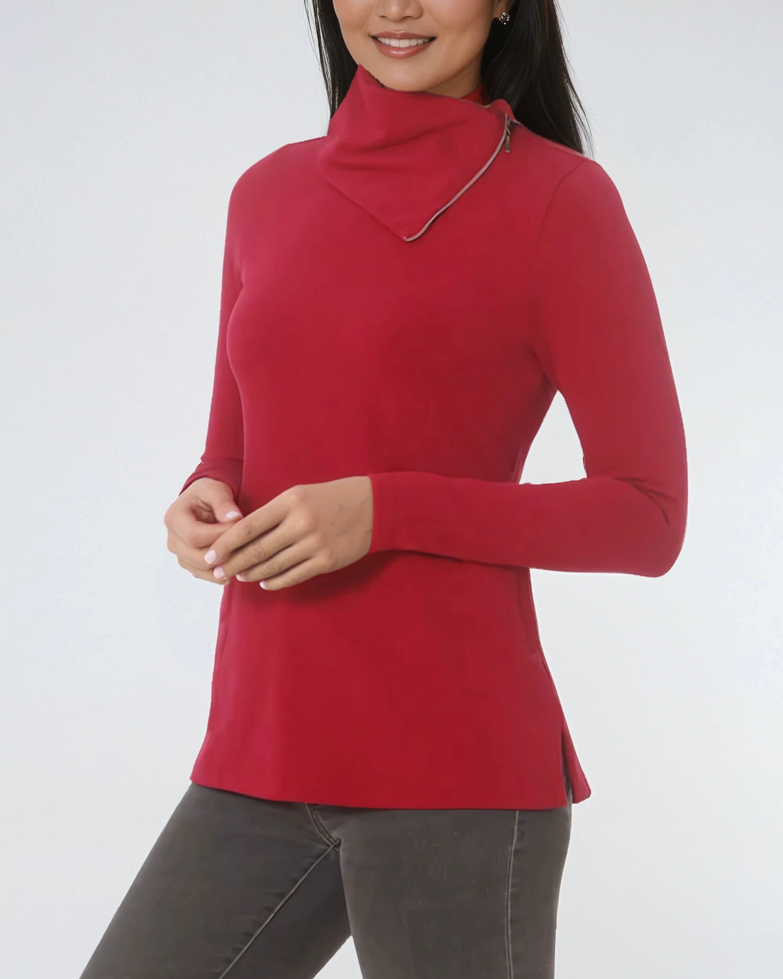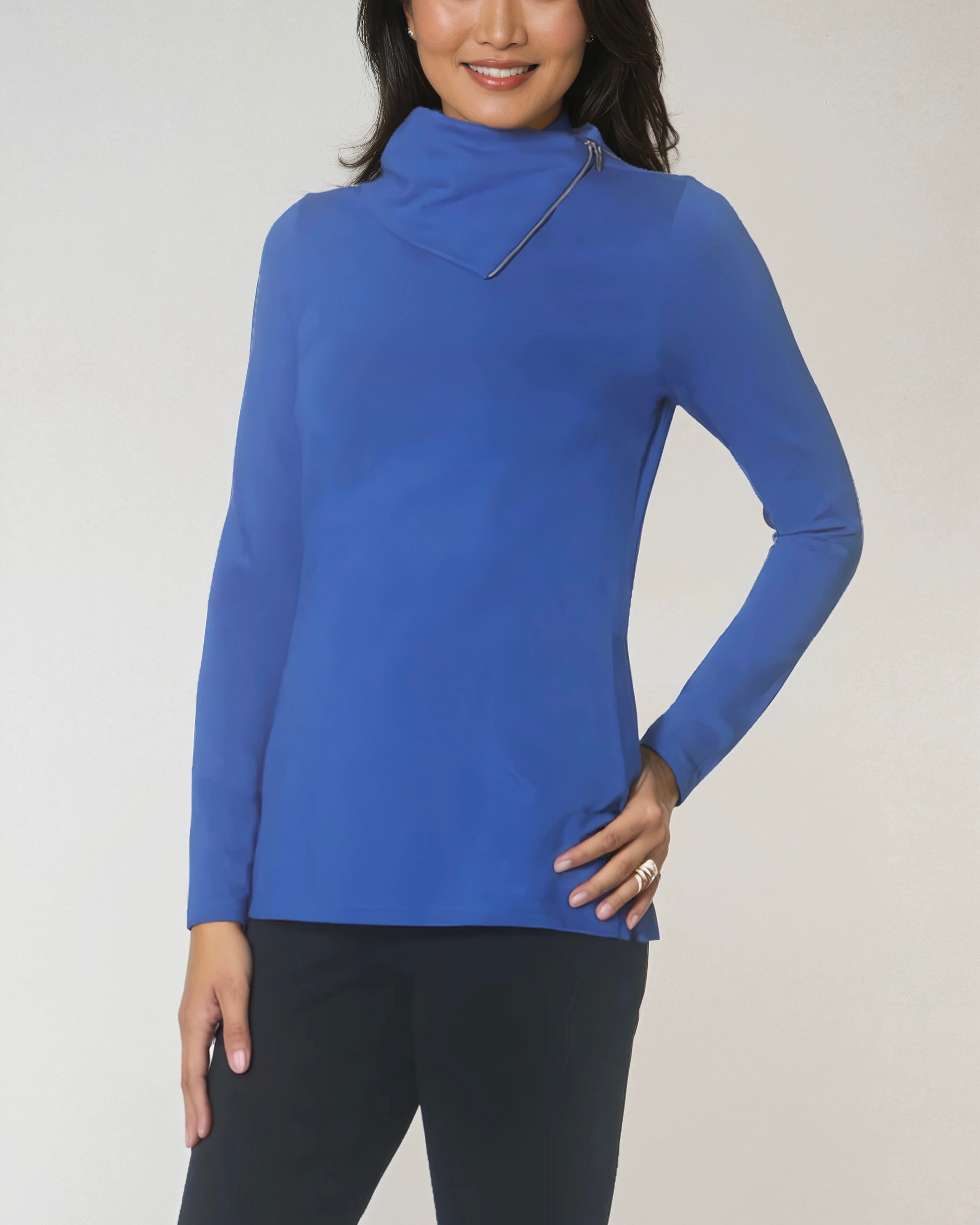 The Zermatt Fold-Over Turtleneck, knit in our signature yarn blend, offers a sleek and cozy long sleeve, available in a earthy hues Putty or loud colorways like Red or Electric Blue. It features fold-over turtleneck, complete with a zipper detailing on the side of the collar. It's a versatile layer with to perfectly paired with denim and loafers for early office meetings to snowy days in the city. A cozy and refined piece for chilly seasons.• Care Instructions: Machine wash cold, Only non-chlorine bleach when needed, Tumble dry low, Cool iron OR Professional dry clean.• Fabric Content: 96% Pima Cotton / 4% Spandex• Country of Origin: Peru