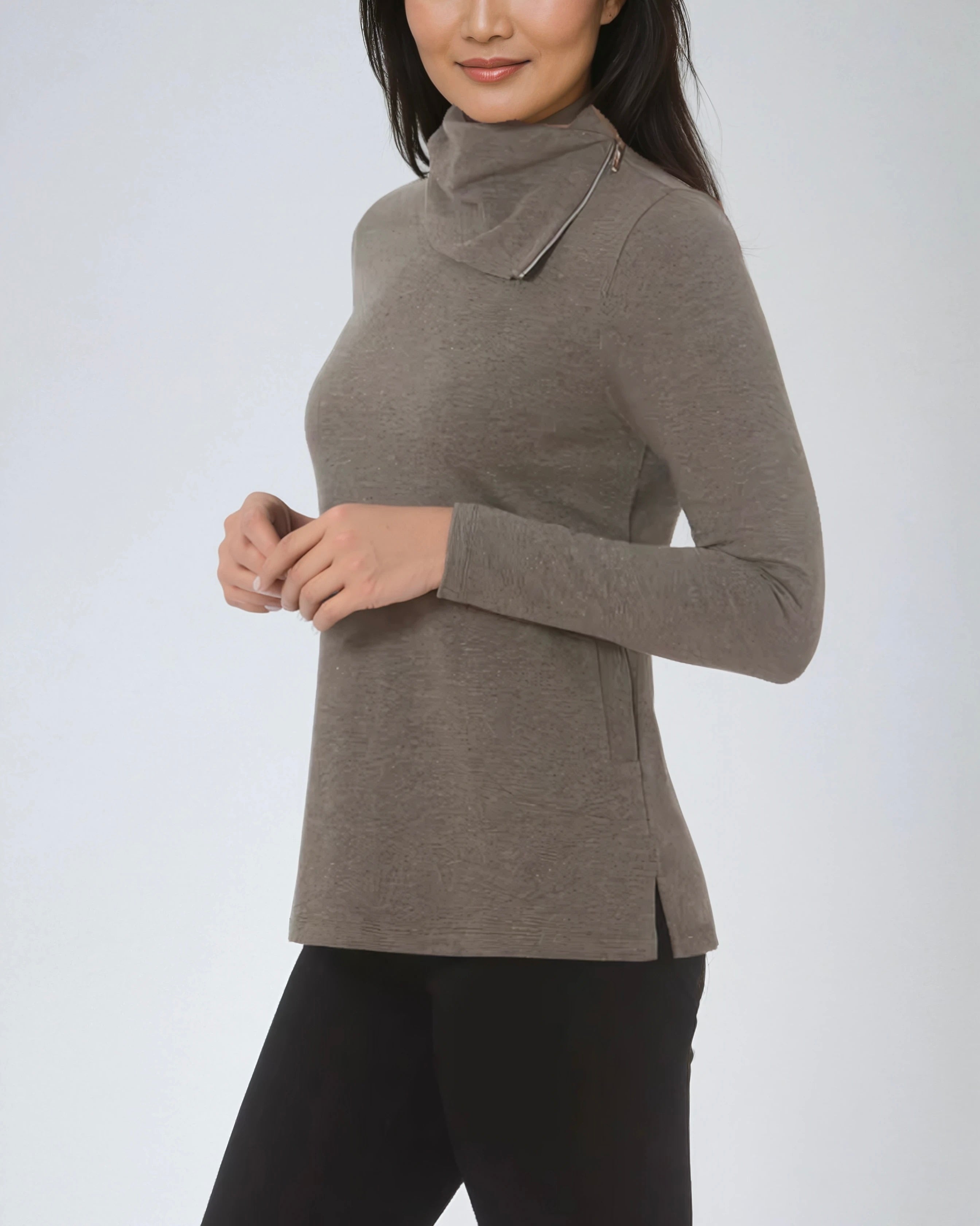 The Zermatt Fold-Over Turtleneck, knit in our signature yarn blend, offers a sleek and cozy long sleeve, available in a earthy hues Putty or loud colorways like Red or Electric Blue. It features fold-over turtleneck, complete with a zipper detailing on the side of the collar. It's a versatile layer with to perfectly paired with denim and loafers for early office meetings to snowy days in the city. A cozy and refined piece for chilly seasons.