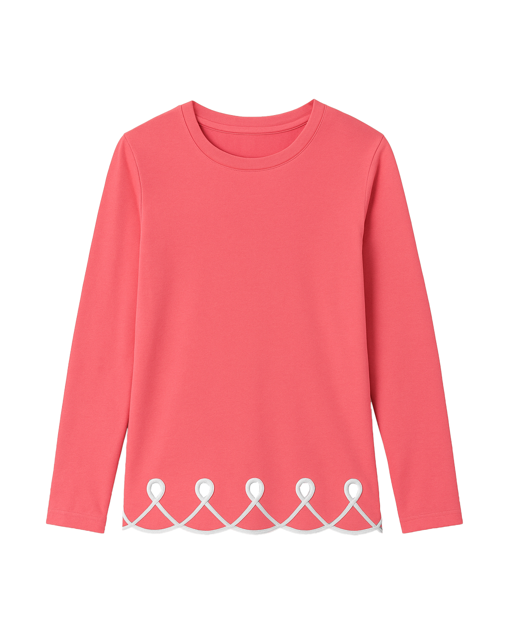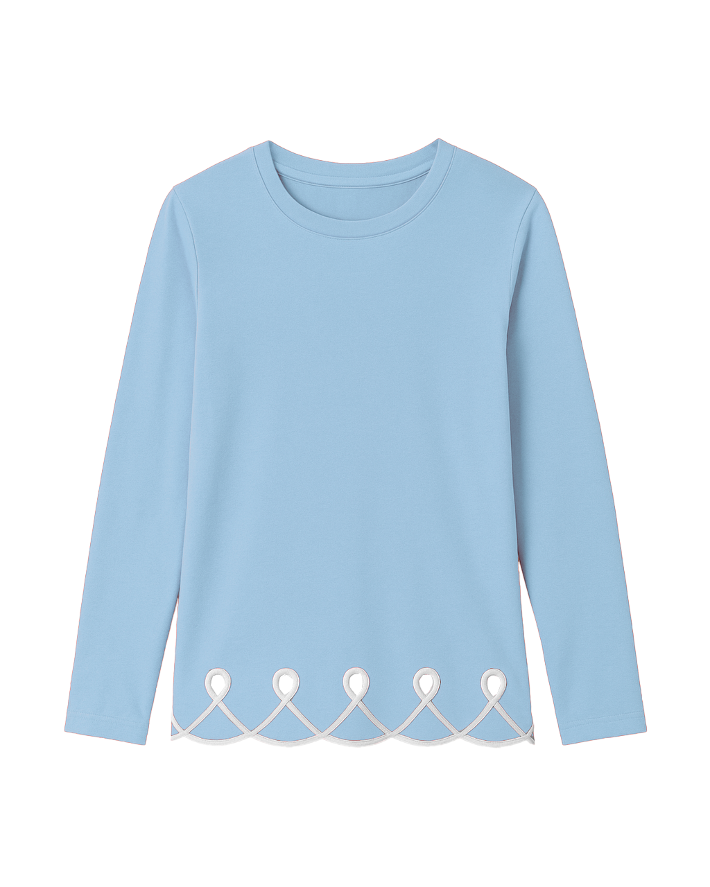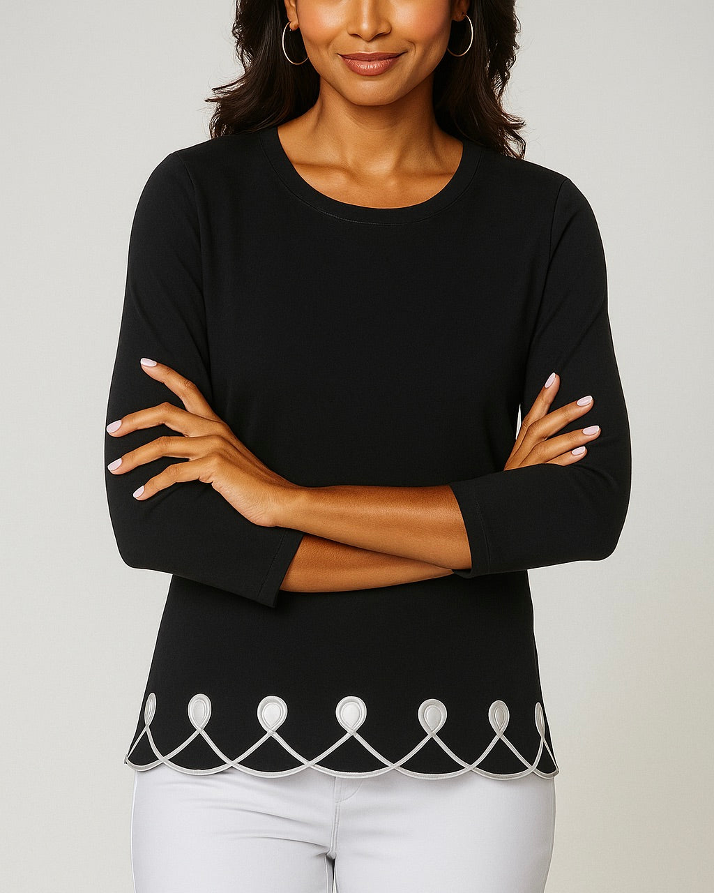 The Amélie Top is crafted in our soft yarn blend, in classics like Black/White or playful hues like Blossom or Turquoise. It's fitted 3/4 sleeves and crew neckline provide timeless comfort, while the scalloped hem with delicate circular cutouts adds a touch of feminine detail and lightness. This versatile piece pairs effortlessly with tailored trousers or casual denim, perfect for evening dinners or weekend gatherings. Intricate detailing on a classic style.• Care Instructions: Machine wash cold, Only non-chlorine bleach when needed, Tumble dry low, Cool iron OR Professional dry clean.• Fabric Content: 96% Pima Cotton / 4% Spandex• Country of Origin: Peru