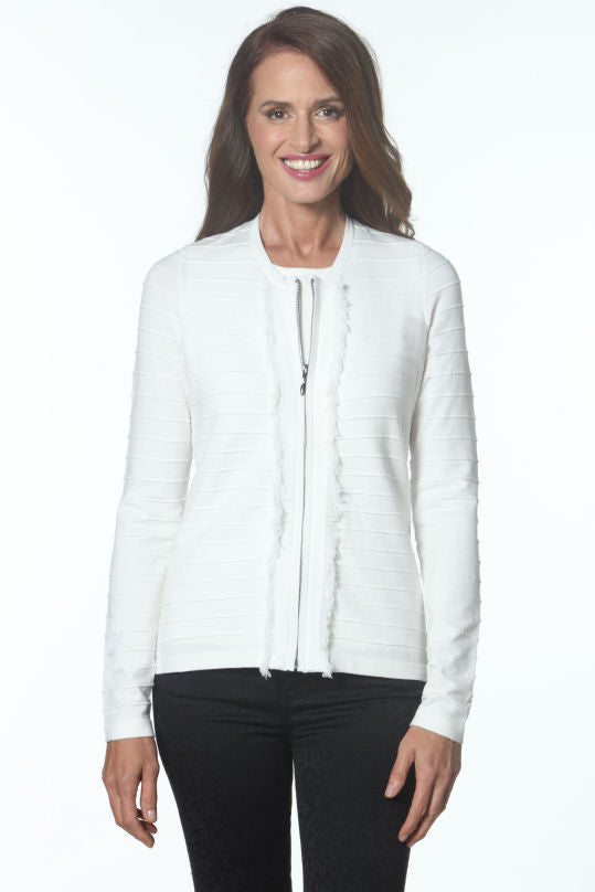 With its textured finish and expressive fringe details, The Chania Fringe Jacket brings a bold coastal spirit to classic tailoring. Designed in our Stolen Softness™️ Proprietary beloved yarn blend, this piece makes a statement through movement and dimension—thanks to its horizontal stripe texture. It's complete with a center front zipper closure, decorated with a fringe trim. Whether worn over crisp shirting or a simple knit, the jacket adds instant personality and polish. Effortlessly striking, it's a modern layer perfect for breezy strolls on the pier. A vibrant, playful take on a refined style.
