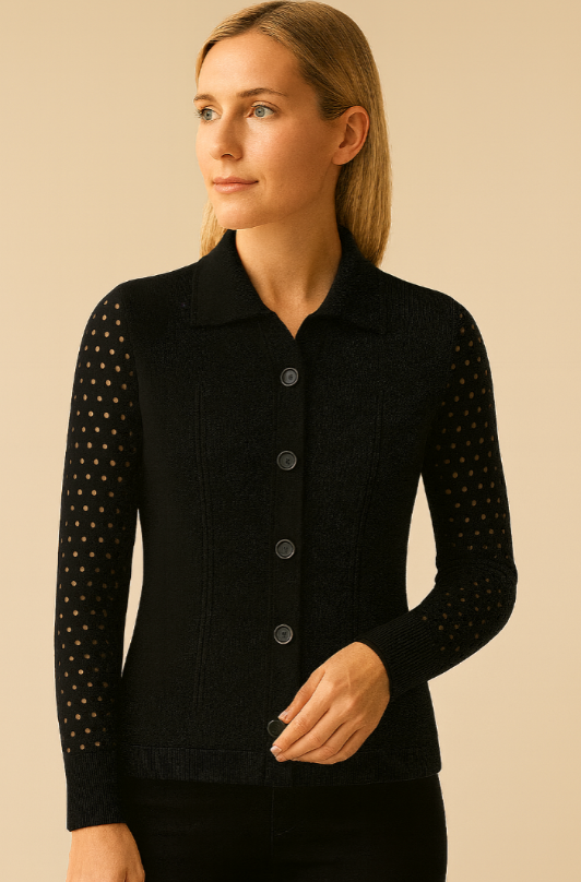 Created in our Stolen Softness™️ Proprietary beloved yarn blend, the Málaga Eyelet Sleeve Jacket is effortlessly structured with a modern twist. While it has a sleek bodice, the sleeves are decorated with a eyelet fabric. Designed with a classic fold-over collar and button closure, this layer offers an elevated twist on a typical jacket. Available in Sand, Black, or White, it is the perfect item to wear as a statement piece or layered over any knit. A stylish choice for walks in the park or paired with denim to shop in the market.