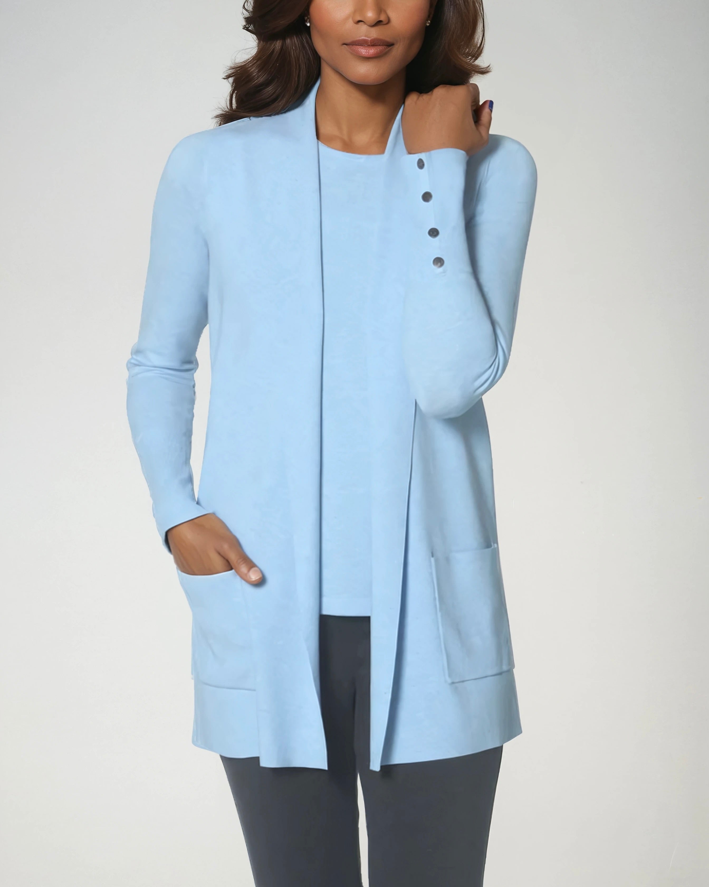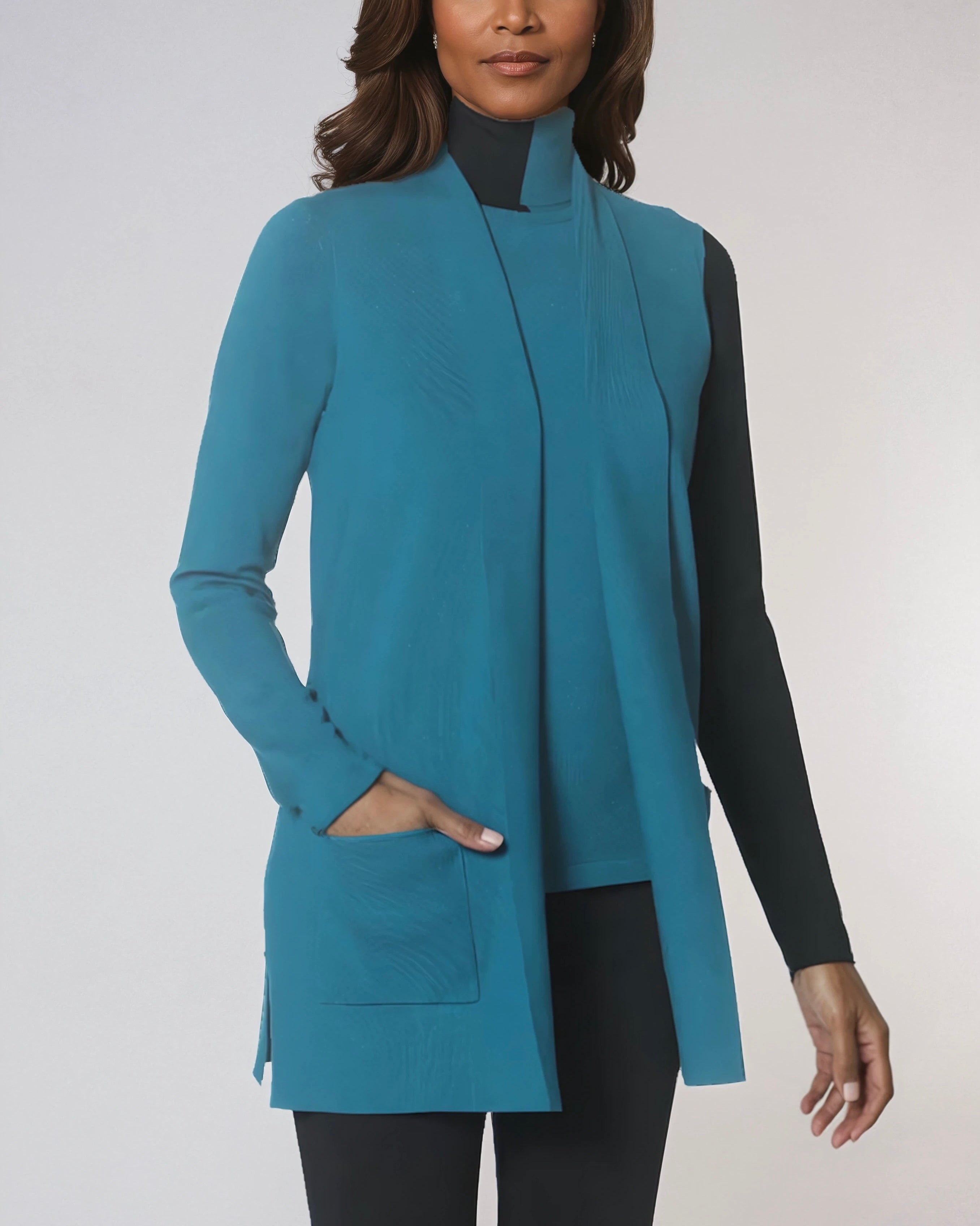 Spun in Stolen Softness™️ Proprietary beloved yarn blend, the The Shift Relaxed Vest offers warmth with a relaxed, sleeveless silhouette. Designed with a clean front and large armholes, it layers effortlessly over shirts or knits. A soft collar frames the neckline, while large front pockets add dimension to a simple, yet sleek item. Available in muted colors like Charcoal or Camel or playful hues like Sky and Teal -- to add a pop of color into your wardrobe. Lightweight yet substantial—ideal for transitional layering for crisp walks through the park. A sleek and vibrant option for layering piece.