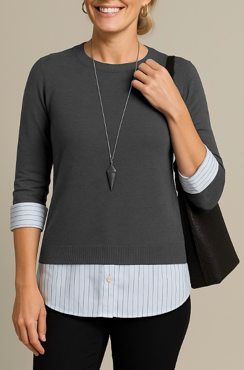 The Toulon Layered Sweater blends knitwear comfort with the structure of shirting. Designed, in our Stolen Softness™️ Proprietary beloved yarn blend and wovens, with a relaxed fit, it features a soft sweater body paired with a woven button-up panel that peeks from the hem—creating the illusion of artful layering without the bulk. The contrast adds tailored polish to a cozy staple, perfect for office days, casual dinners, or weekend gallery strolls. Sleek, poised, and sophisticated.