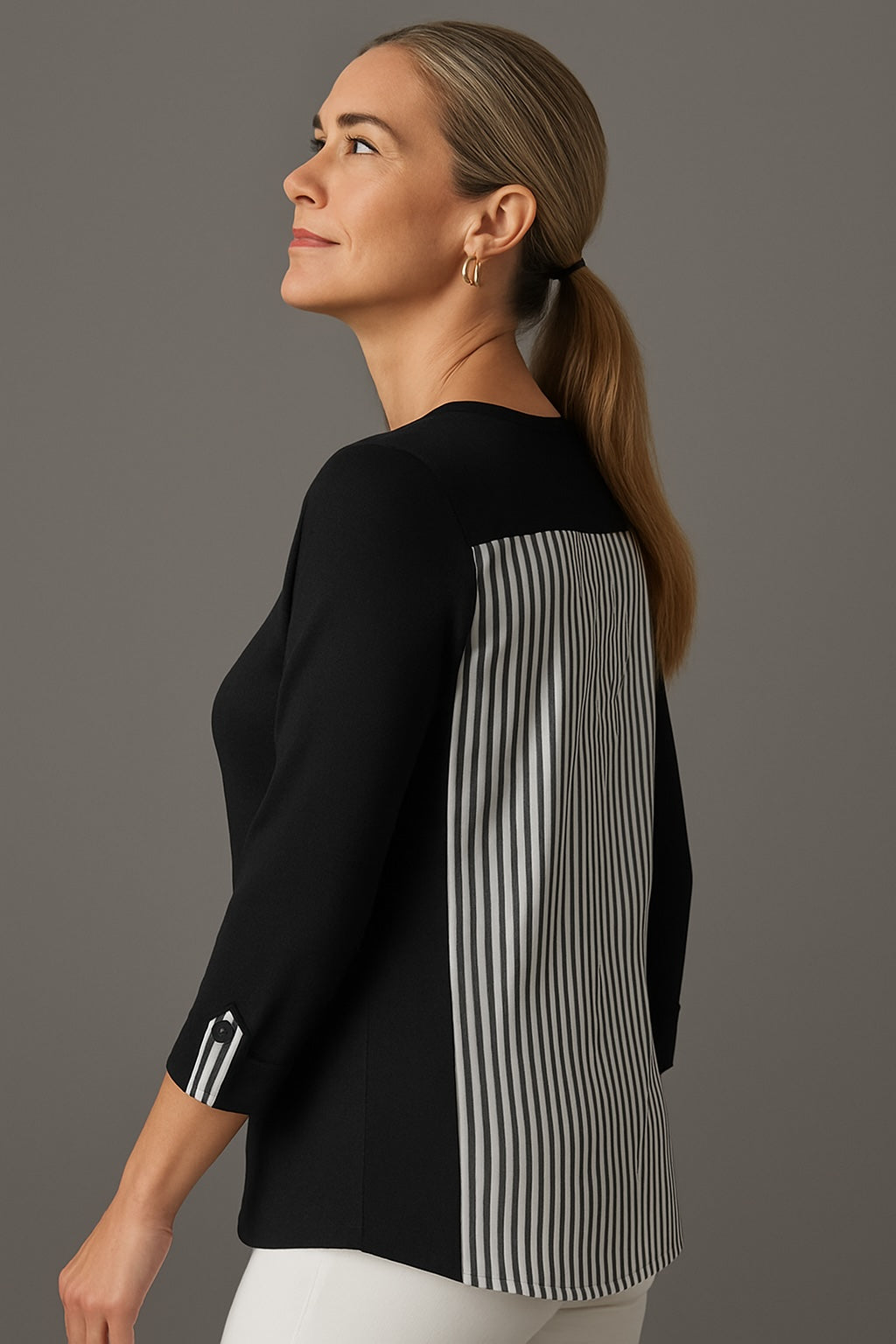 A harmonious blend of textures and tailored details, The Liora Duel Fabric Top elevates casual chic with effortless ease. The soft knit front features a classic crew neckline and a subtle button placket, while the contrasting woven back panel—with its crisp vertical stripe print and button placket on cuff—adds dimension and unexpected sophistication. With relaxed 3/4 sleeves and a flattering silhouette, this top is perfect for elevating work ensembles or wearing for casual days for a polished, modern look.