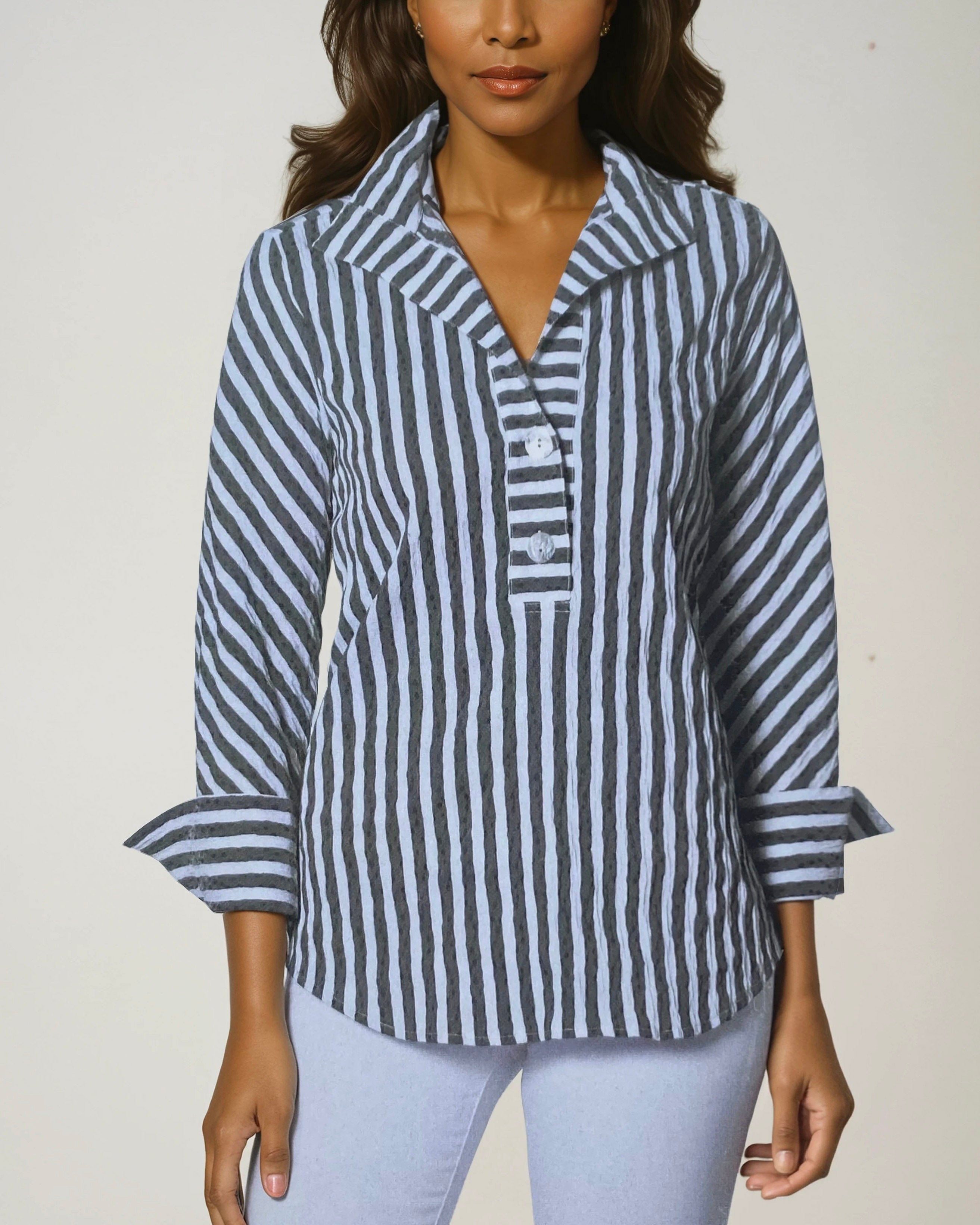 In our 'Panama' fabric, the Brighton Henley Top captures the easy rhythm of life. Designed with bias-cut sleeves for soft movement, it features a classic collar and a partial Henley button placket that keeps the silhouette clean and effortless. Lightweight and breathable, it's the perfect throw-on for breezy mornings, shoreline strolls, or coffee by the harbor. Available in sweet Petal/White or neutral Sand/White, ideal to wear it loose or tucked—either way, it's timeless coastal ease.
