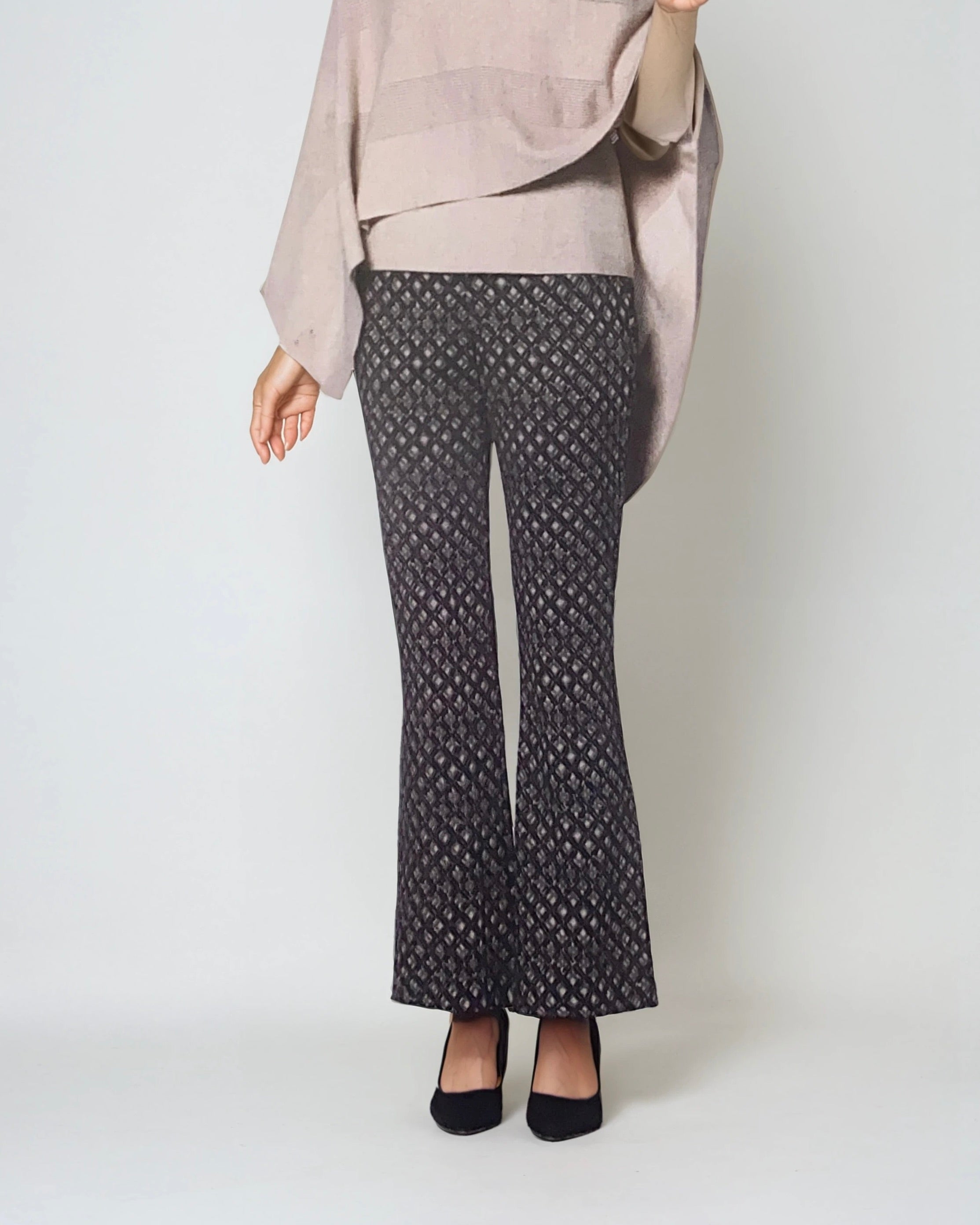 The Lorient Flared Pant feature a flared ankle silhouette that moves with ease. Crafted with a striking dark abstract print and finished with a zipper closure, these pants blend bold style with effortless comfort. Perfect for adding a touch of refined energy to your everyday wardrobe. Ideal for pairing with a blouse for afternoon art events or with a sleek sweater for evening dinners. An abstract take on a timeless and poised silhouette.