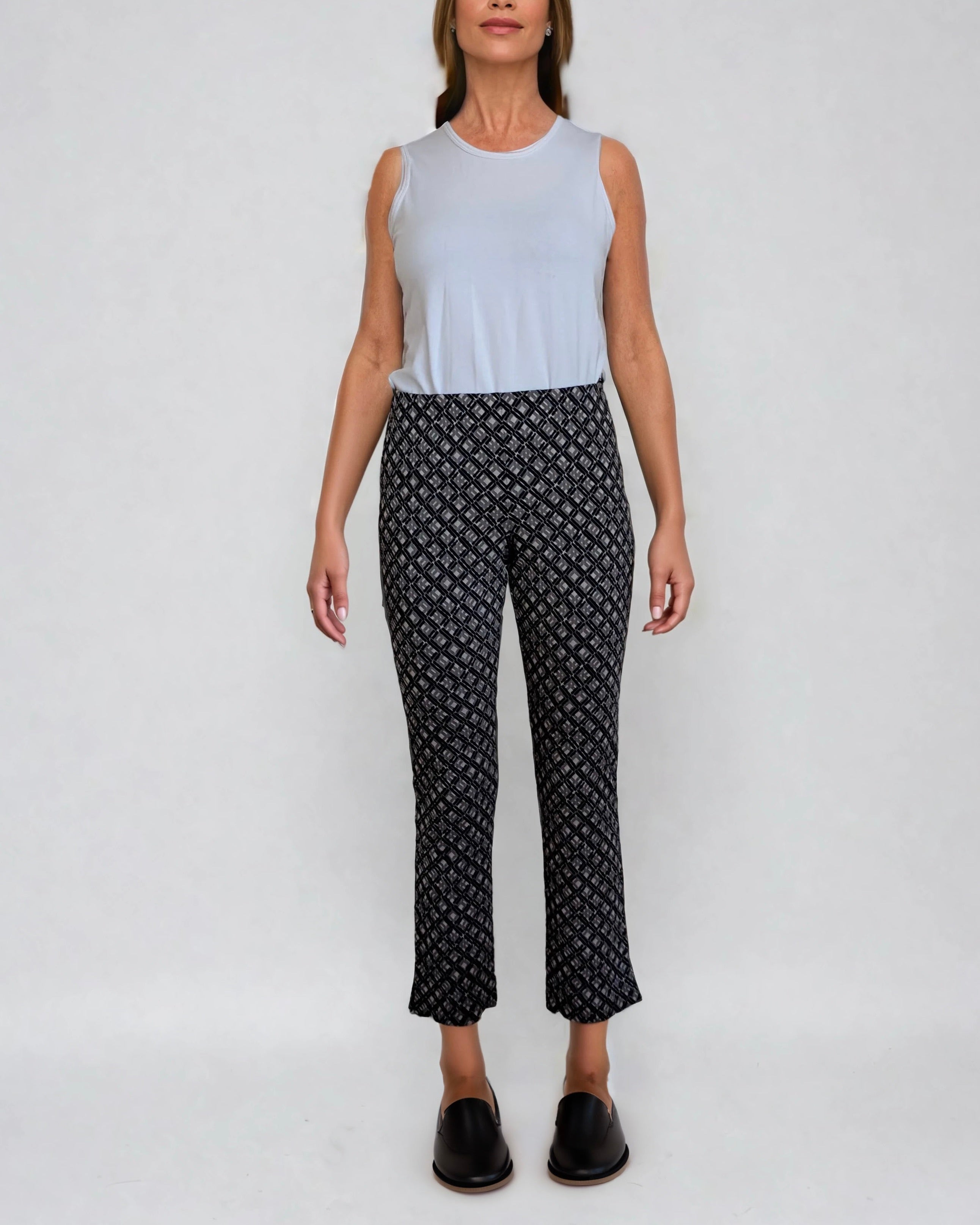 The Lugo Ankle Pant offer a modern twist on a classic silhouette. Featuring a dark abstract print, straight-leg cut, zipper closure, and ankle slits, they combine edgy detail with effortless style. Perfect for pairing with a chunky sweater or sleek blazer, it adds a sleek finish to both casual and polished looks. These pants bring contemporary sophistication to your wardrobe.