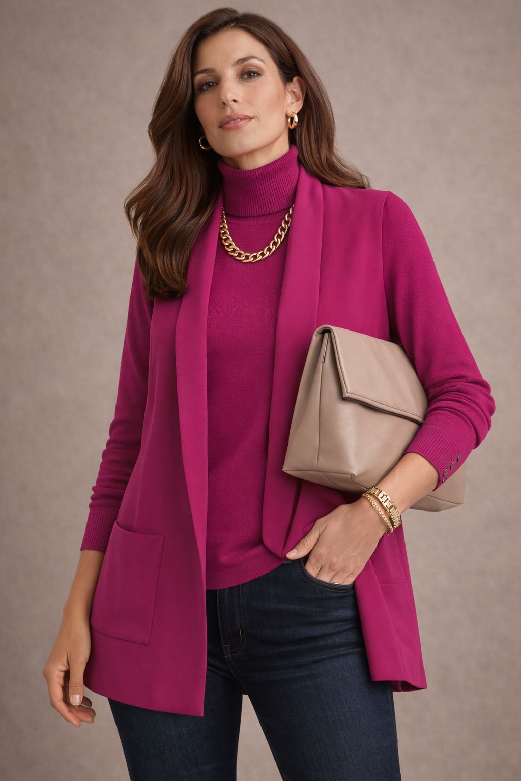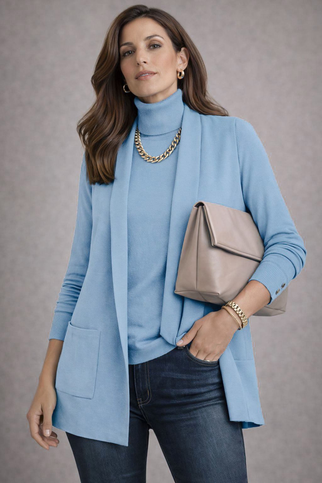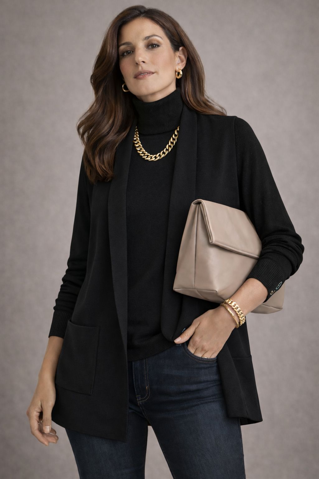 This vest is a year round, slimming superstar! The fabric is soft and contains no wool. It is an effortless outfit maker! I buy this for my studio on repeat.