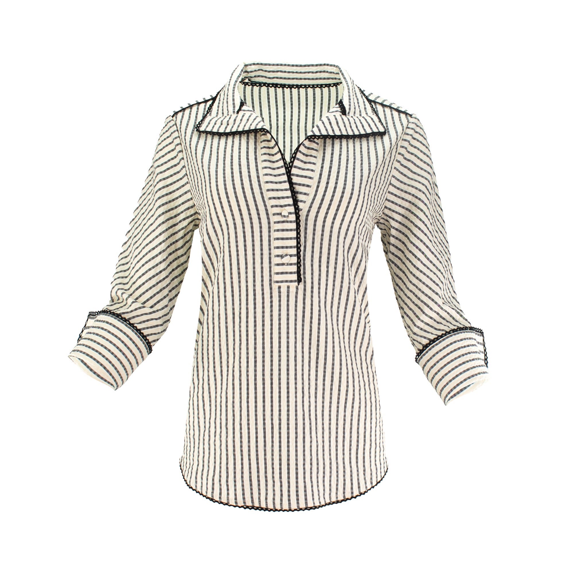 The Ravenna Tunic captures the easy elegance — reimagined in a versatile, wear-anywhere silhouette. Designed with vertical stripes, button cuffs, and a crisp collar, it's the perfect balance of relaxed and refined. Style it tucked, layered, or loose for a polished coastal look that works from weekday to weekend.