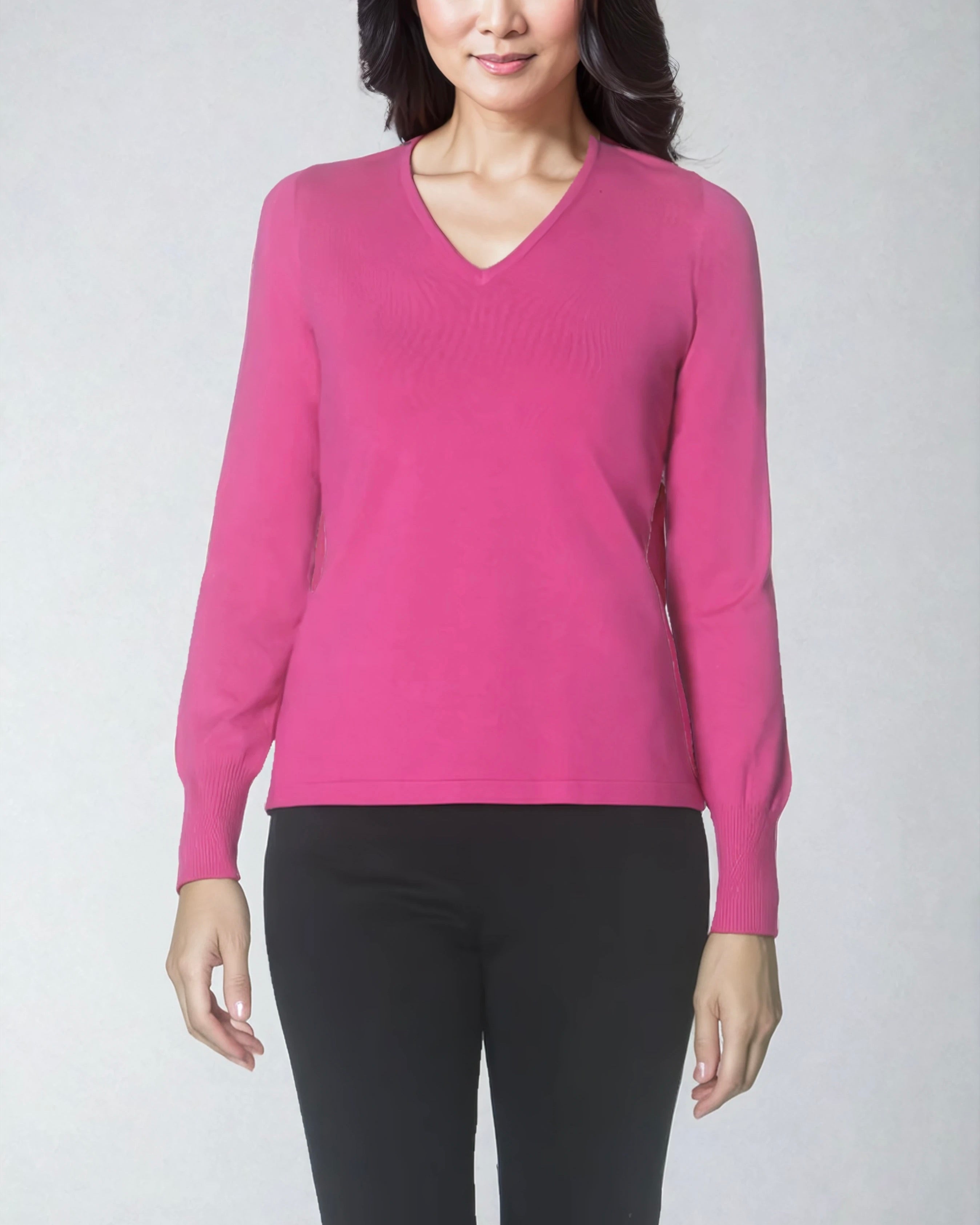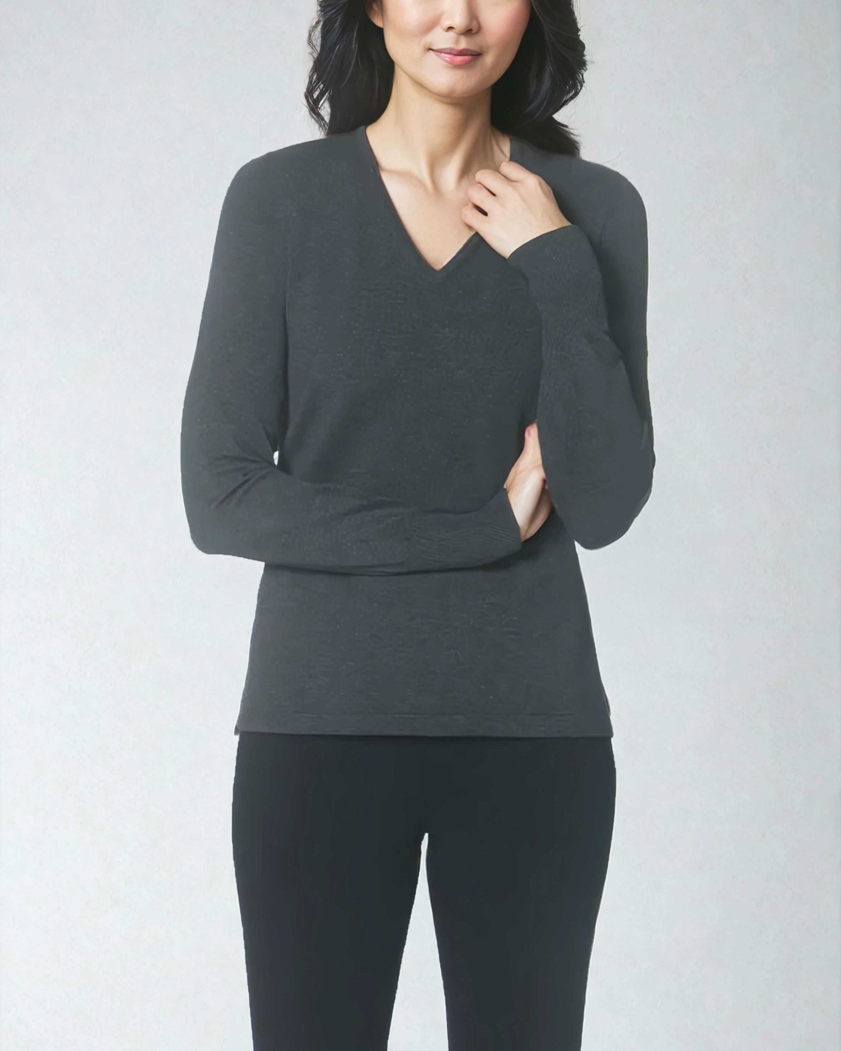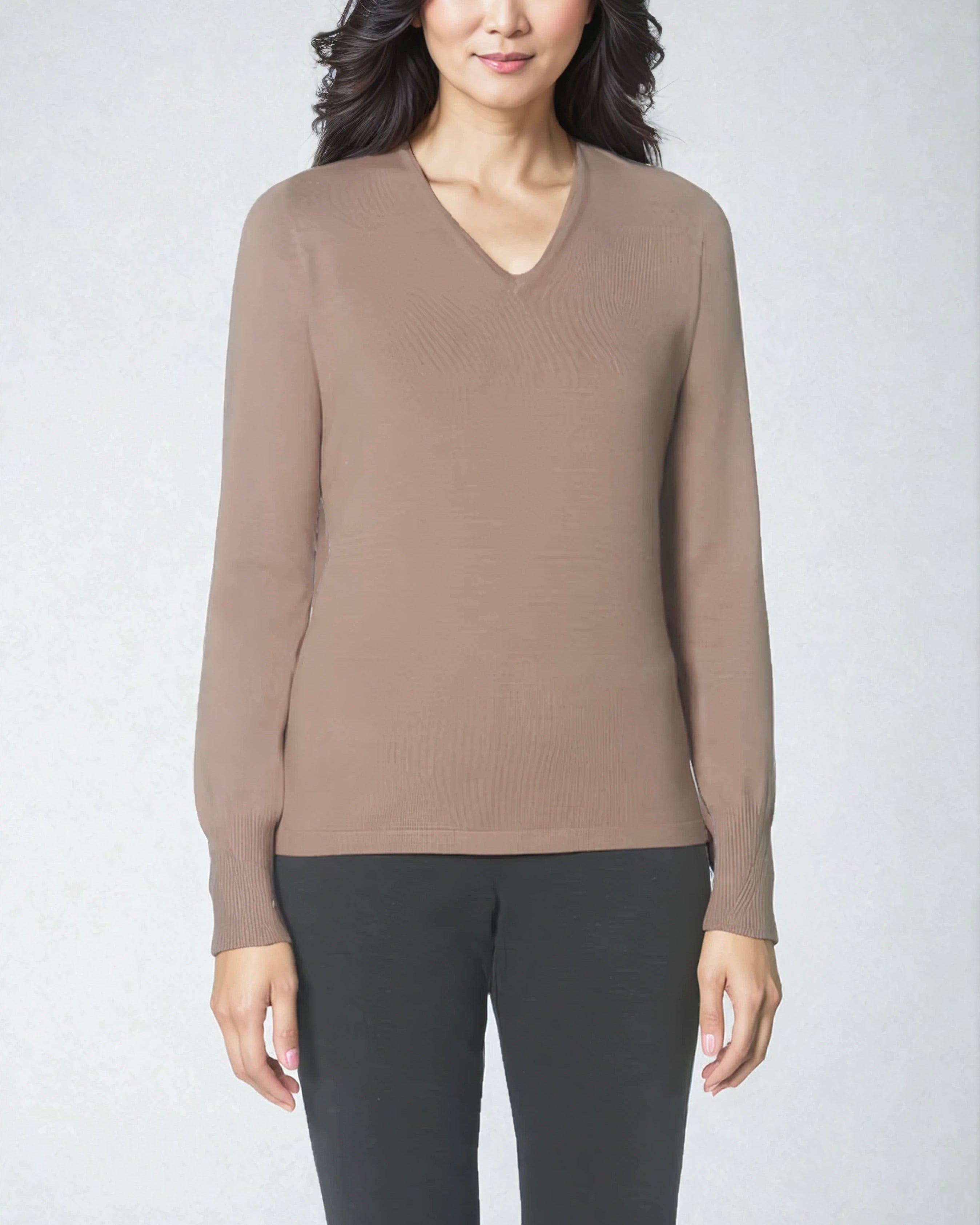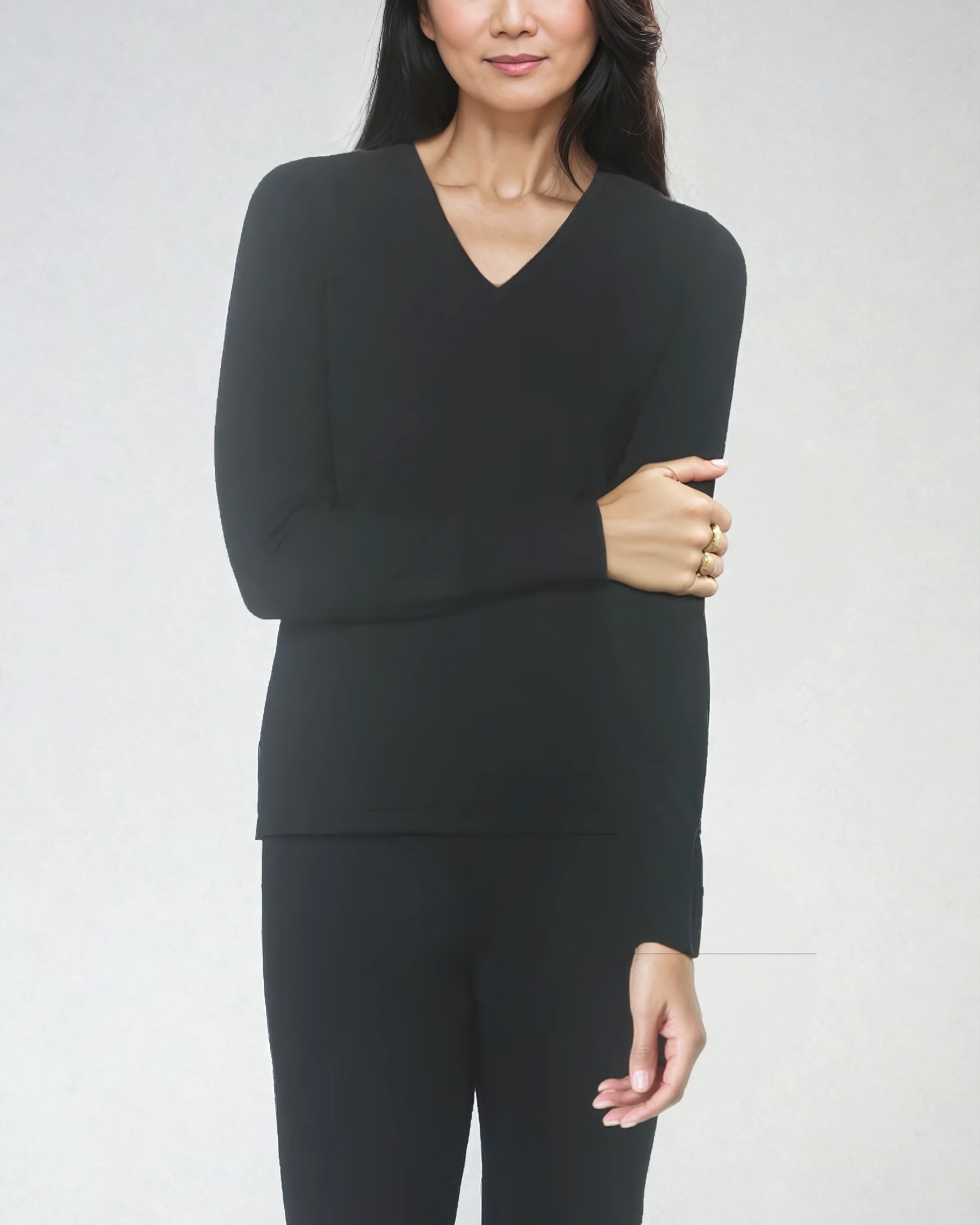 A timeless essential redefined. The Essence V-Neck features a classic long sleeve silhouette crafted from our Stolen Softness™️ Proprietary beloved yarn blend. Designed with slight puff sleeve, it subtly transitions to fitted ribbed cuffs that gently hug the wrist —adding a touch of delicate volume and effortless elegance. Perfectly versatile, this top balances simplicity with a hint of feminine detail, making it a wardrobe staple for every season.