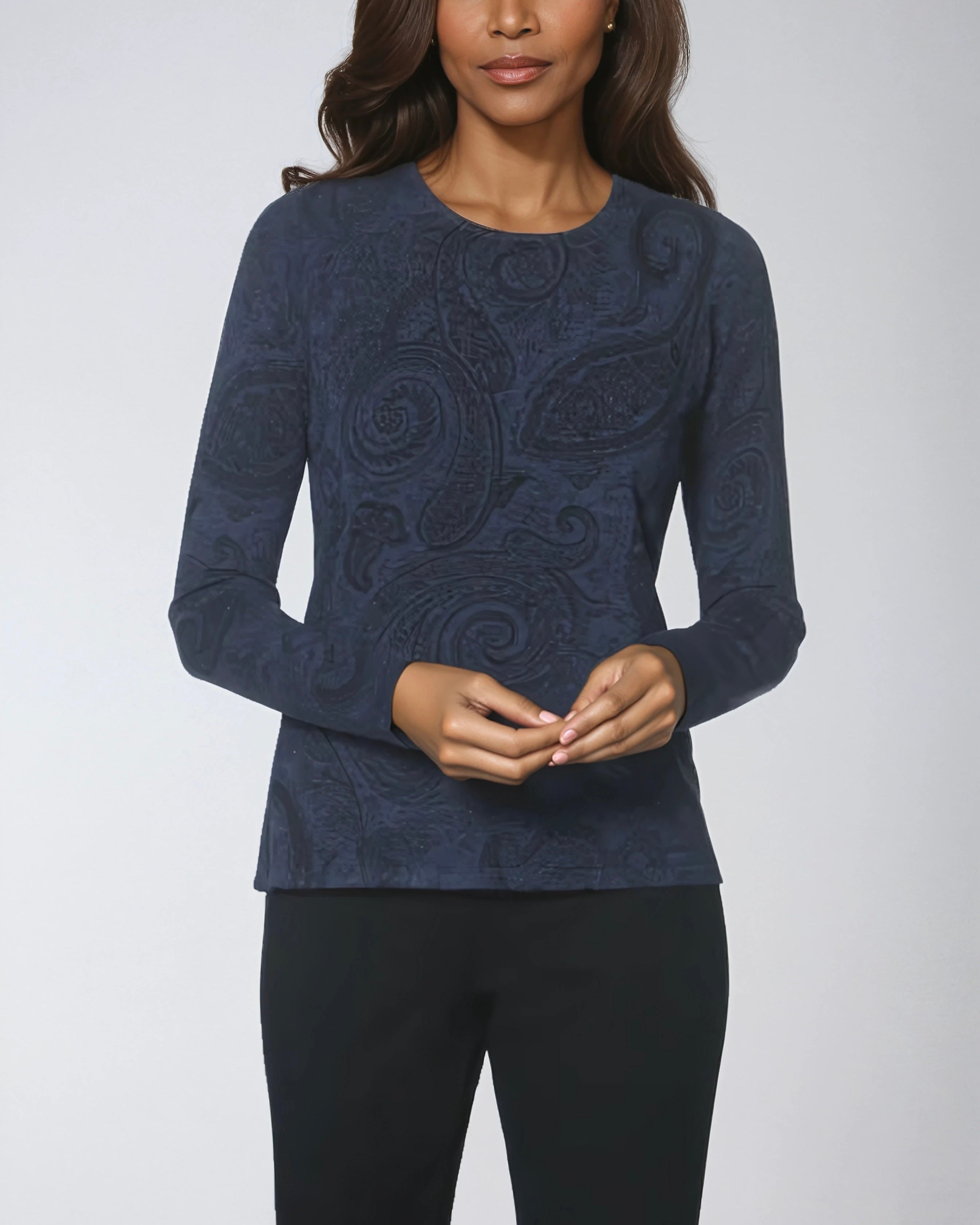 Crafted in our Stolen Softness™️ Proprietary beloved yarn blend, The Marrakesh Paisley Top is feminine piece that hugs the body without feeling tight. The deep V neckline flatters the frame, while the long sleeves and fitted silhouette make it ideal for layering or wearing solo. A paisley print covers the top and is available in rich Indigo and warm Fawn that lends a touch of old-world charm with modern refinement. Timeless yet expressive, it's a versatile piece that transitions seamlessly from day to dinner -- paired with denim or a skirt.