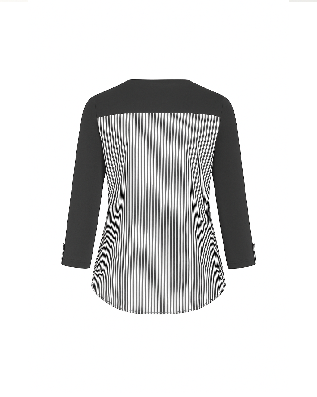 A harmonious blend of textures and tailored details, The Liora Duel Fabric Top elevates casual chic with effortless ease. The soft knit front features a classic crew neckline and a subtle button placket, while the contrasting woven back panel—with its crisp vertical stripe print and button placket on cuff—adds dimension and unexpected sophistication. With relaxed 3/4 sleeves and a flattering silhouette, this top is perfect for elevating work ensembles or wearing for casual days for a polished, modern look.