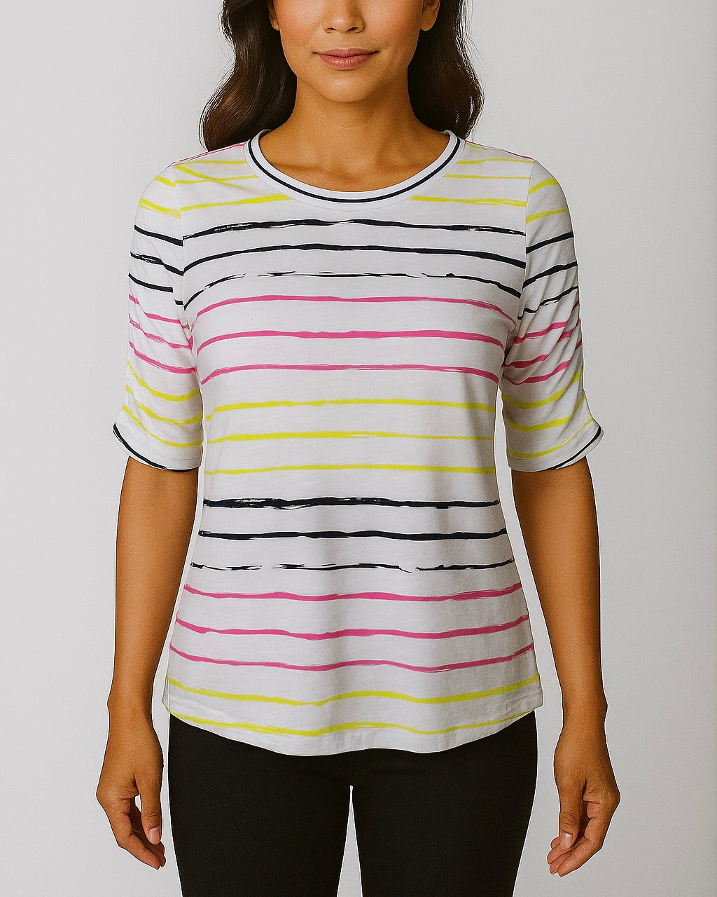 The Syros Striped Top captures vibrant charm with a touch of effortless polish. Designed with a crew neckline, it features elbow-length sleeves with gentle ruching from shoulder to cuff—adding soft texture and a hint of movement. The horizontal stripes in Black, Pink, and Yellow play boldly against a crisp White backdrop, bringing energy to this relaxed silhouette. Easygoing yet refined, it's made for sun-drenched days and golden hour escapes.