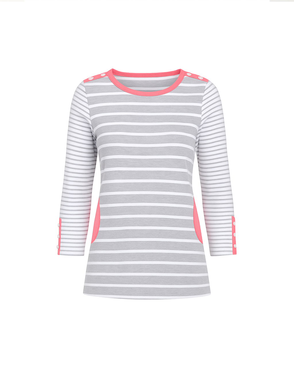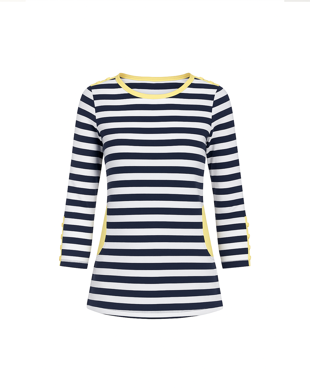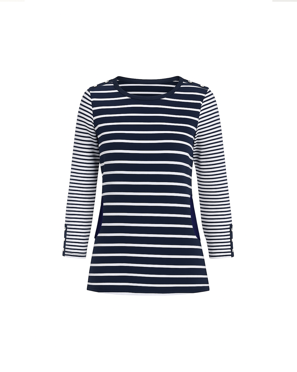 The Vela Striped Top is defined by its thoughtful detailing and streamlined silhouette. Crafted in our soft yarn blend with a fitted-but-easy shape, it features classic horizontal stripes along the body, while the sleeves are finished with finer lines for subtle contrast. Cuff buttons add polish and quiet structure—elevating this timeless piece with just a hint of tailoring. Wear it tucked into crisp trousers or casually draped over denim—it's coastal simplicity, with a refined edge. Ideal for coastal getaways or sunny afternoons at the farmer's market. A relaxed take a on a classic, coastal style top.• Care Instructions: Machine wash cold, Only non-chlorine bleach when needed, Tumble dry low, Cool iron OR Professional dry clean.• Fabric Content: 96% Pima Cotton / 4% Spandex• Country of Origin: Peru