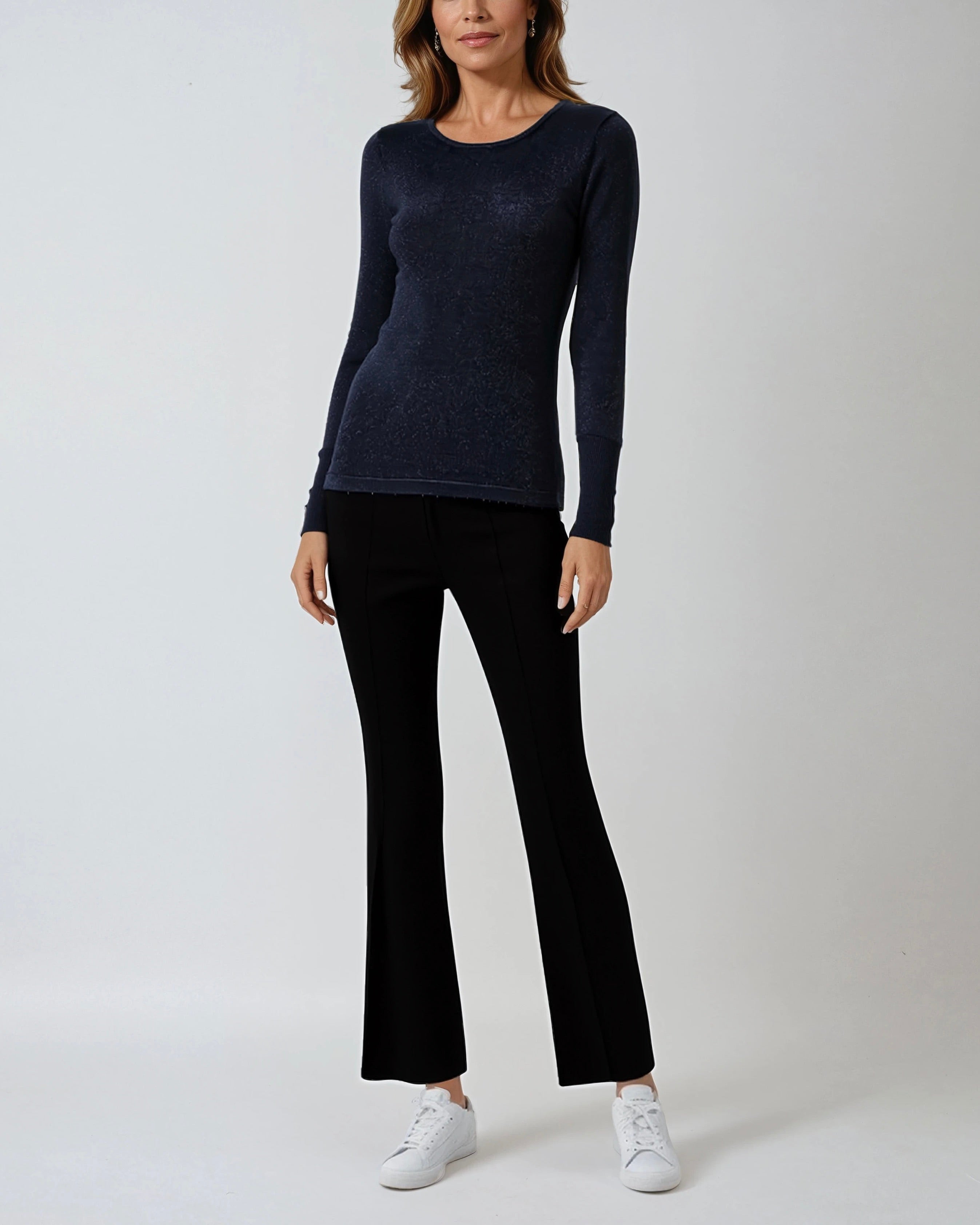 Radiate effortless sparkle in the Celestine Tunic, crafted from a shimmery version of our Stolen Softness™️ Proprietary beloved yarn blend, that catches the light beautifully. With a soft crew neckline, long sleeves finished with ribbed cuffs, and delicate metallic buttons adding a touch of glam, this tunic feels feminine and polished. Available in luminous Gold and sleek Black, it's the perfect piece for elevating day-to-night looks. Chic, shimmery, and a versatile staple for your wardrobe.