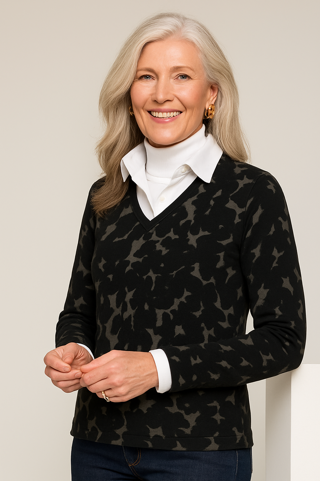 Sleek and statement-making, The Cuba Camo V-Neck is crafted in a smooth, body-skimming knit that flatters without clinging. The deep V neckline adds definition, while the long sleeves and tailored fit make it ideal for layering or wearing solo. Its abstract camo-inspired print—graphic yet muted—offers a modern edge with a nod to urban cool. Available in earthy neutrals like Indigo/Black or Putty/Black, it's a confident and interesting piece that transitions seamlessly from day to night. Perfect for flea market visits.