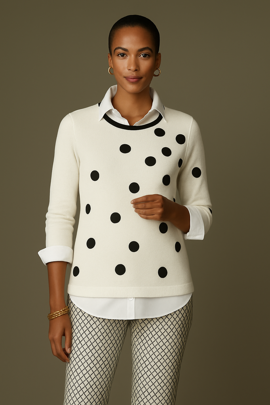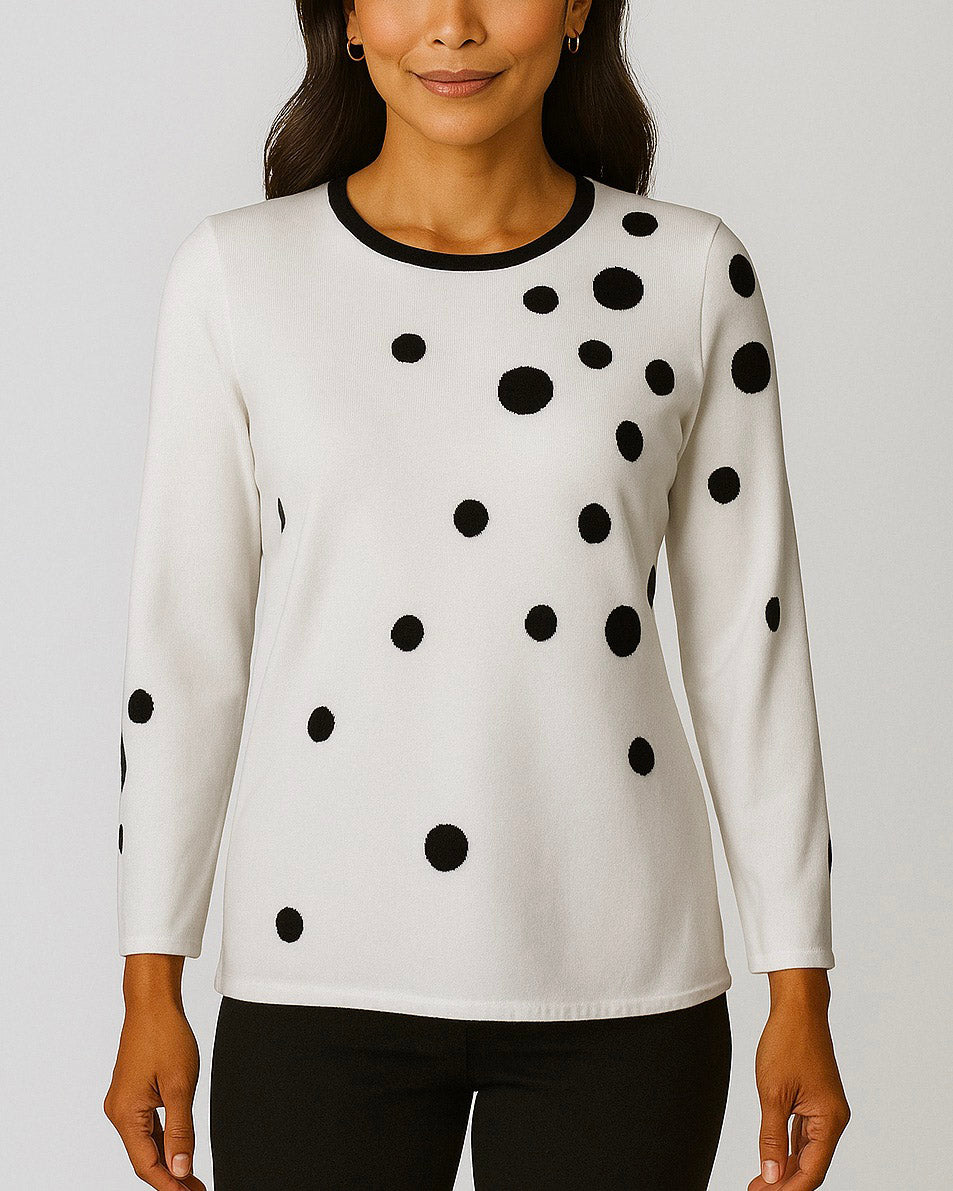 Our Toulouse Dot Top, spun in our Stolen Softness™️ Proprietary beloved yarn blend, offers a playful spin on a basic long sleeve top. Sculpted with a fitted silhouette and crew neckline, it fits to the body smoothly. Complete with a polka dot print, it's a perfect piece to bring any look to life. Available in Black/White , the design pairs with tailored trousers, or a skirt. Perfect for transitional weather for dinner dates or adding dimension to everyday office looks. A playful and artistic take on a classic silhouette.