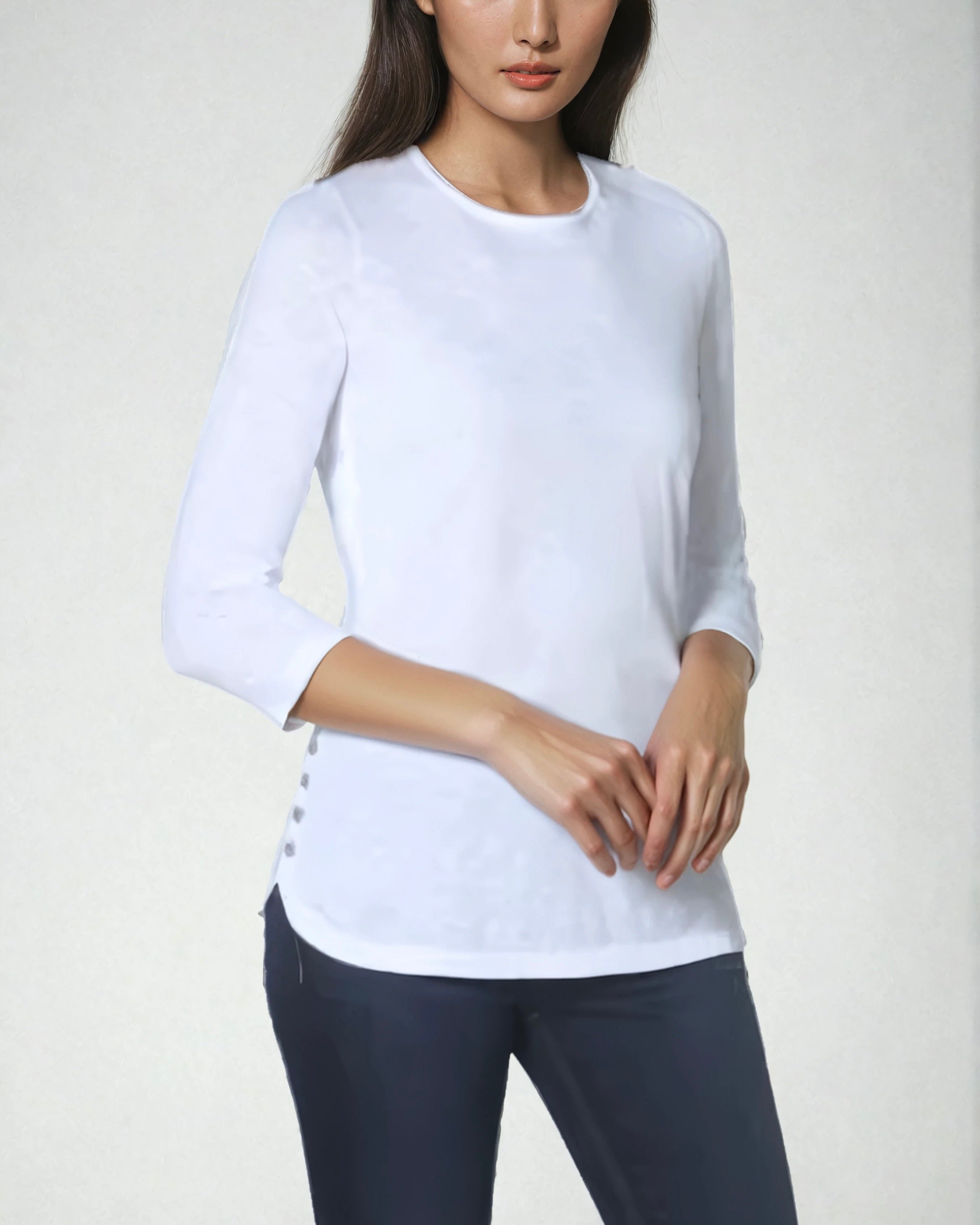 Made in our signature yarns, The Ericeira Side-Button Tunic channels laid-back charm. Designed with a graceful scoop hem and side buttons for subtle detail, this ¾ sleeve staple offers a flattering drape that moves with you. Offered in sleek hues of Black or Navy for any evenings, or bright hues of Blossom for sunny afternoons. Whether worn untucked with linen trousers or denim, it captures the relaxed elegance of coastal living.