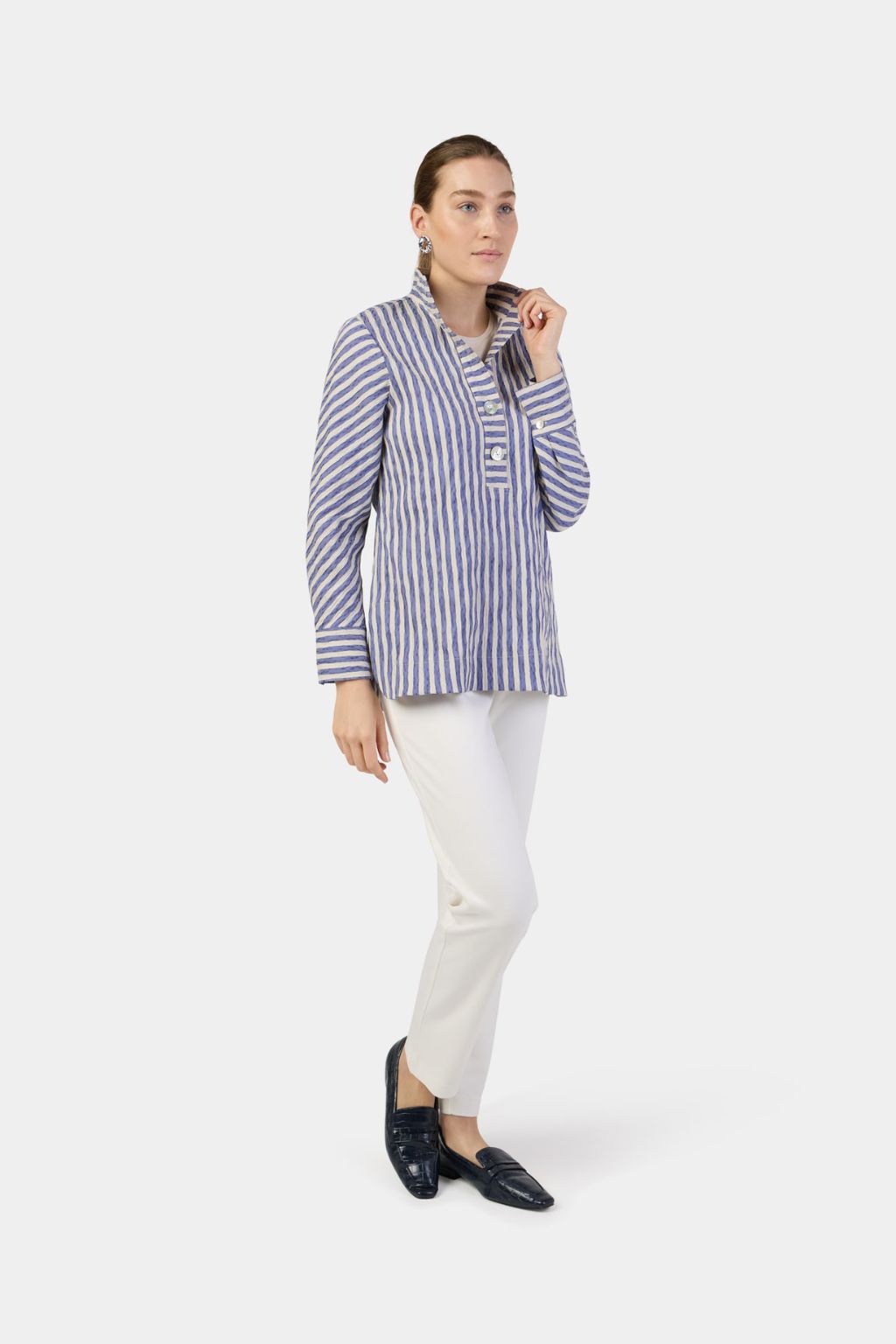 In our 'Panama' fabric, the Brighton Henley Top captures the easy rhythm of life. Designed with bias-cut sleeves for soft movement, it features a classic collar and a partial Henley button placket that keeps the silhouette clean and effortless. Lightweight and breathable, it's the perfect throw-on for breezy mornings, shoreline strolls, or coffee by the harbor. Ideal to wear it loose or tucked—either way, it's timeless coastal ease. Runs true to size—we recommend sizing up for a slightly roomier, relaxed fit.