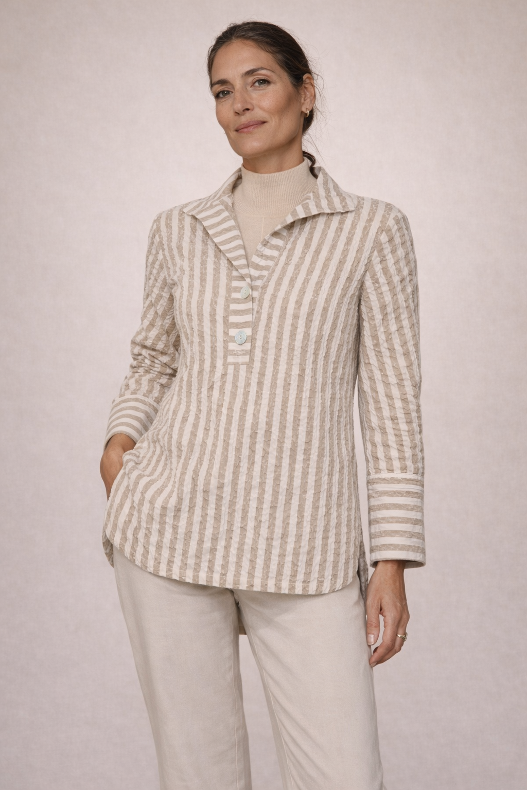 In our 'Panama' fabric, the Henley-Style Tilly Tunic features bias-cut sleeves for soft movement, while a classic collar and a partial Henley button placket that keeps the silhouette clean. It's the perfect option for strolls on the pier or shopping in coastal towns. Ideal for pairing with shorts or linen trousers and to wear loose or tucked. A coastal-inspired piece with modern flair. Runs true to size—we recommend sizing up for a slightly roomier, relaxed fit.