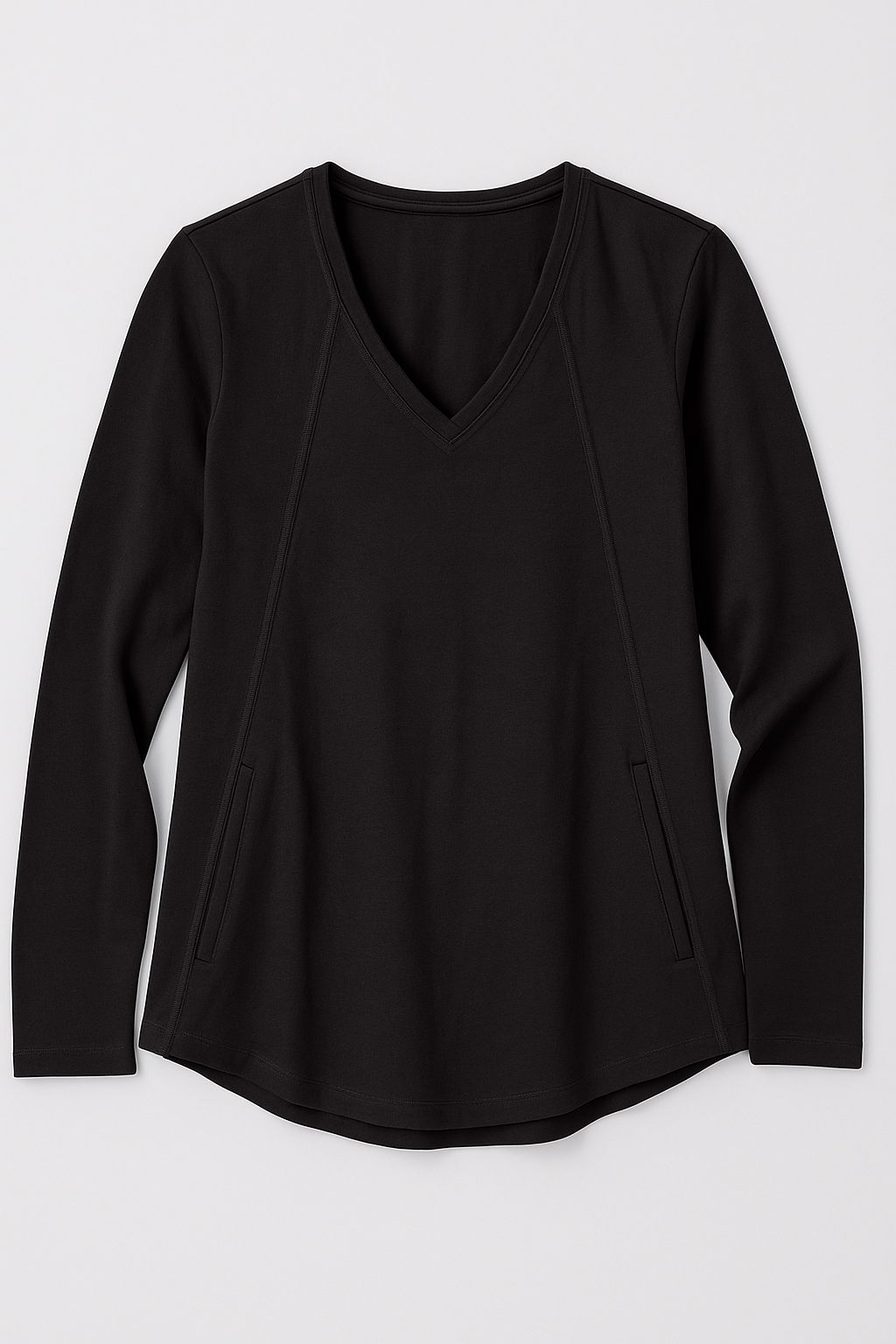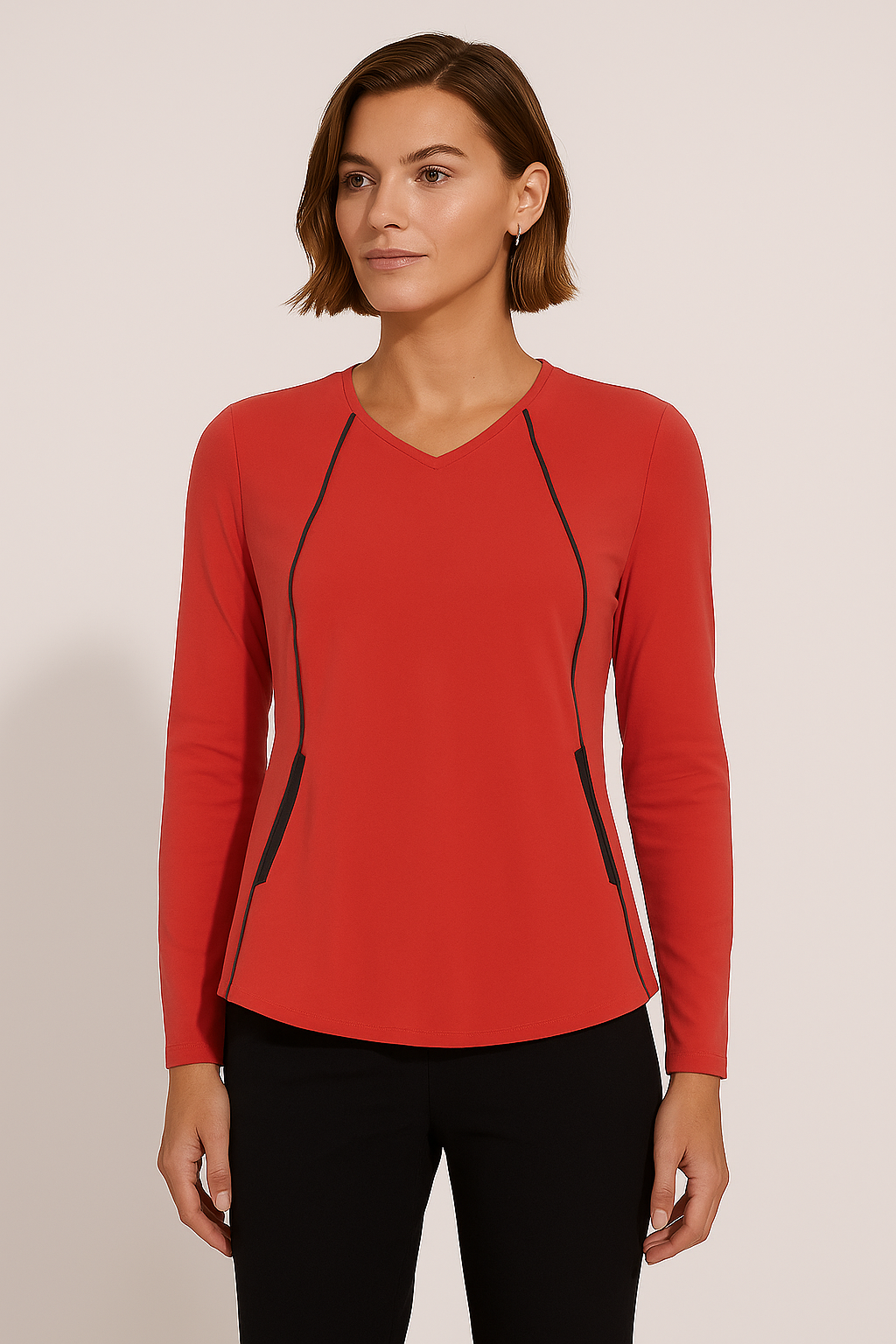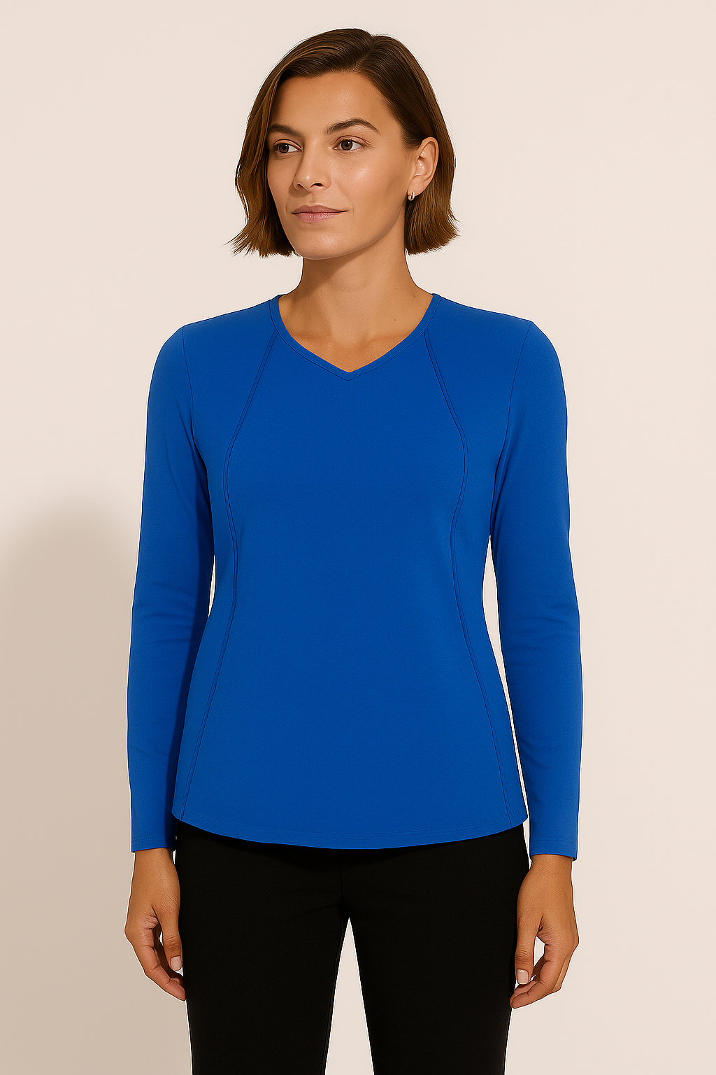 Created in our soft yarn blend, the Eastport Overlock Top brings modern edge to a classic silhouette. Crafted with a flattering V-neckline and long sleeves, it's defined by exposed overlock stitching that traces the front princess seams—adding dimension and shape without overwhelming. With a smooth finish and an relaxed fit, it's a versatile piece that elevates everyday dressing with quiet confidence. Available in Red, Black, or Ultramarine it's ideal for pairing with denim for casual lunches. A simple style with vibrant flair.• Care Instructions: Machine wash cold, Only non-chlorine bleach when needed, Tumble dry low, Cool iron OR Professional dry clean.• Fabric Content: 94% Pima Cotton / 4% Spandex• Country of Origin: Peru