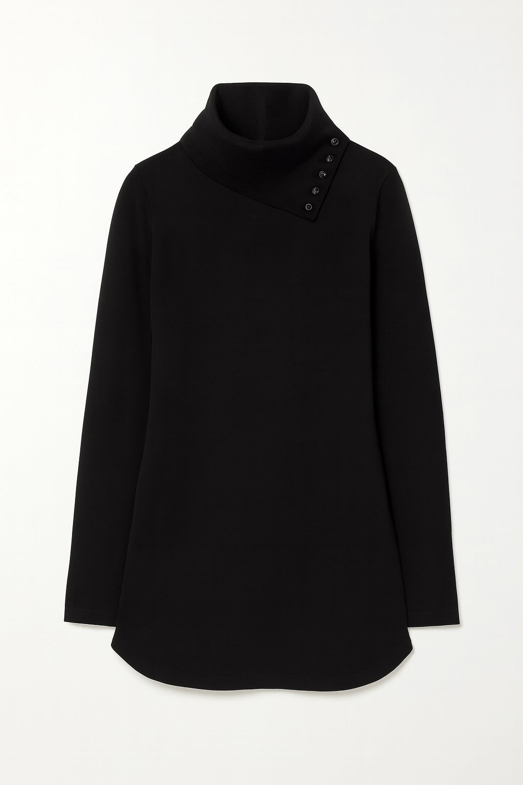 The Kinsale Fold-Over Turtleneck, knit in our soft yarn blend, features a sleek and cozy long sleeve, available in a Black colorway. The fold-over turtleneck, fastened with understated buttons, adds warmth and texture. It's a versatile layer with to perfectly paired with denim and loafers for early office meetings to chilly walks through the park. Cozy, comforting, and refined.
