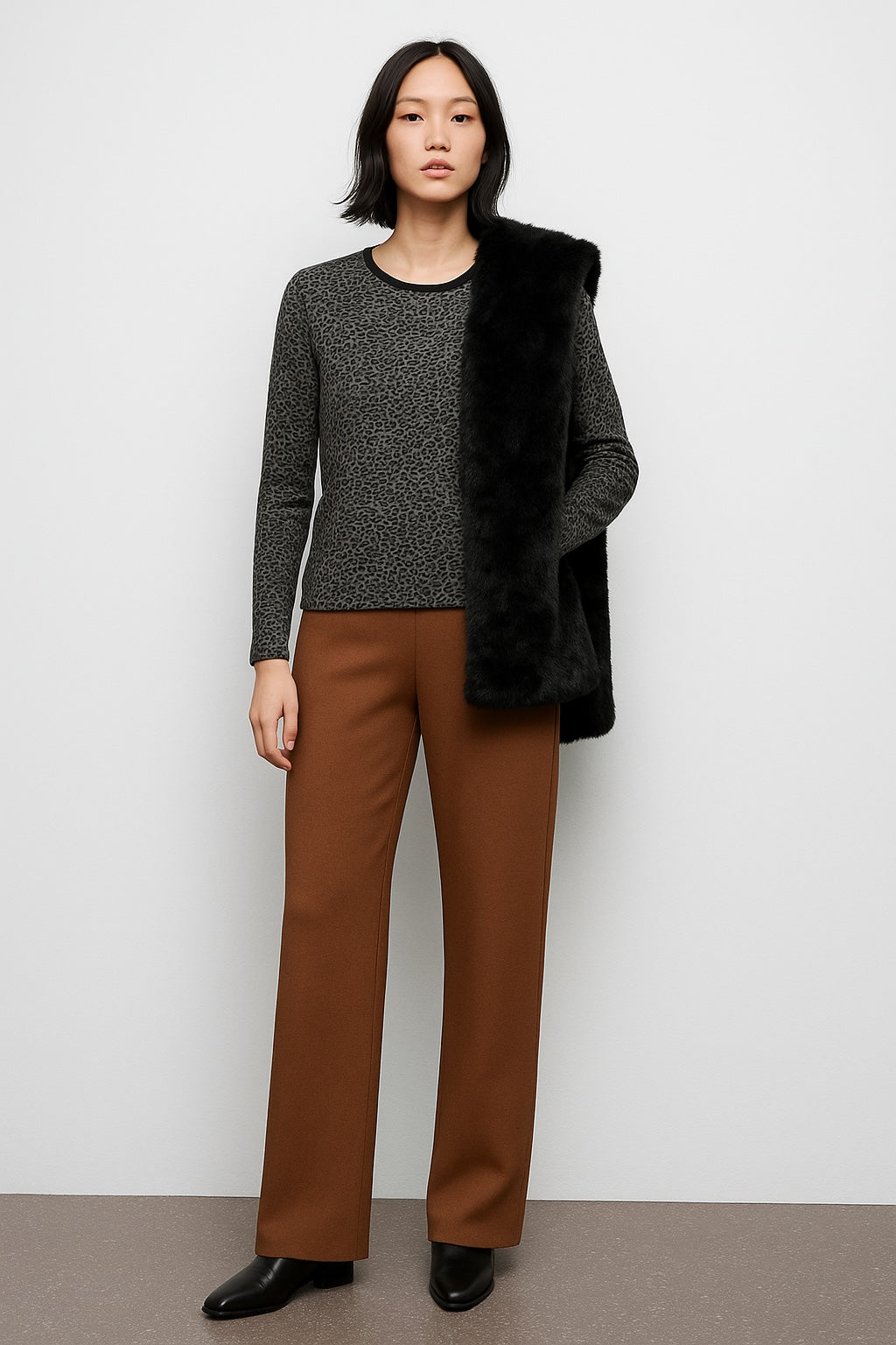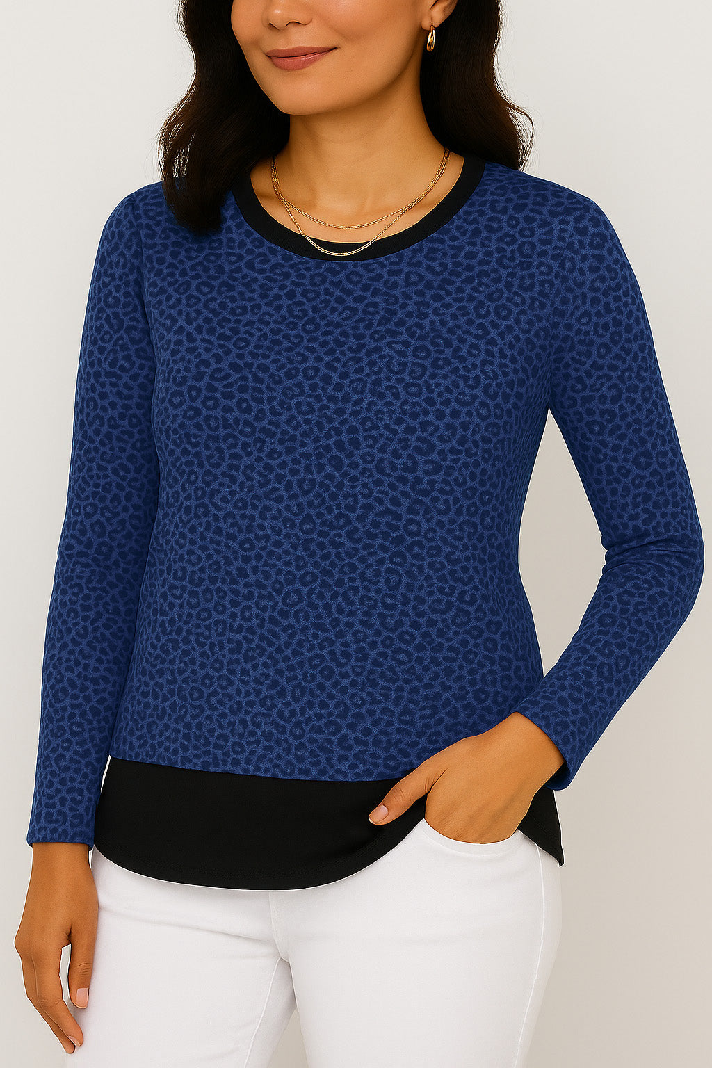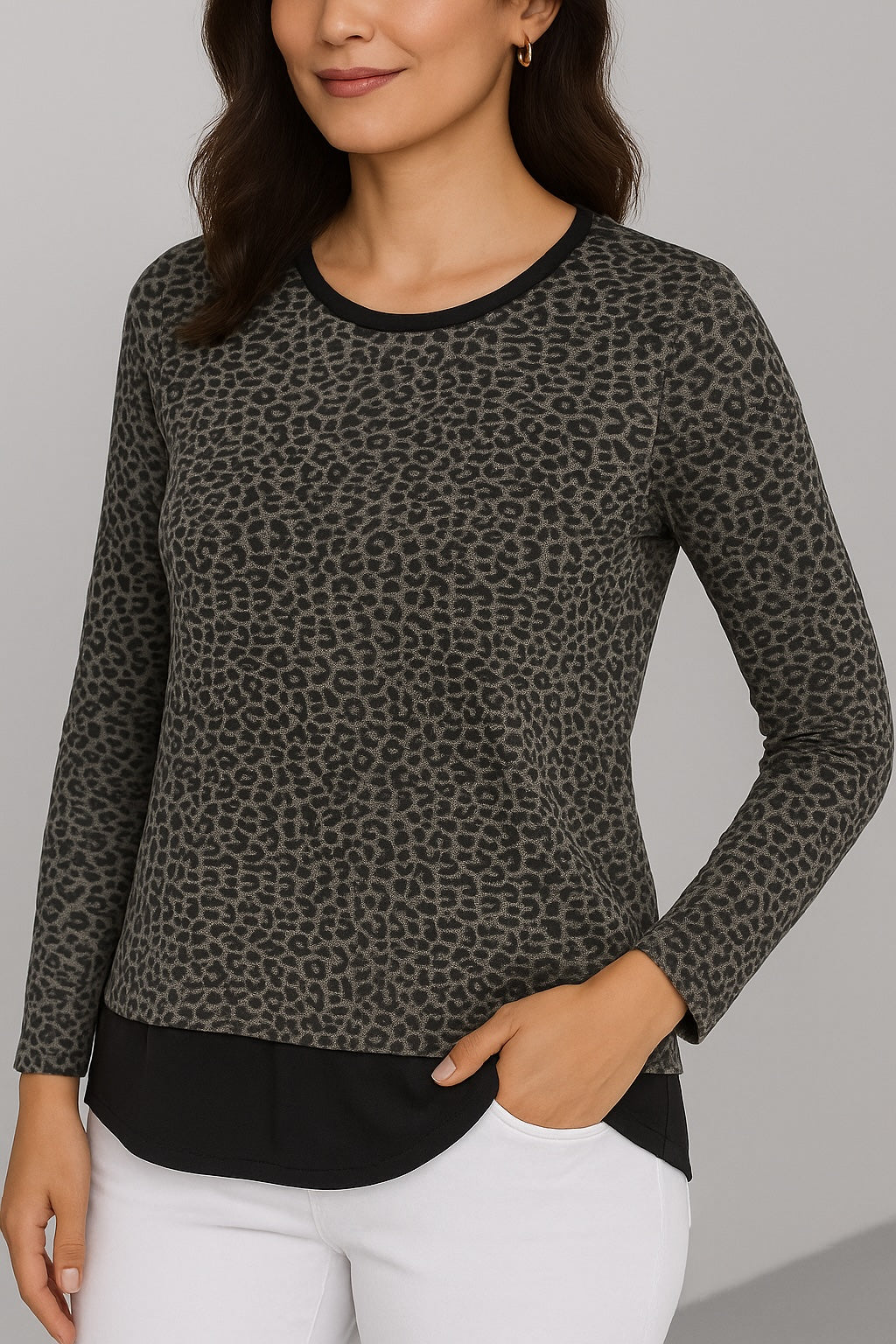 Subtle statement, timeless edge—the Paloma Printed Long Sleeve blends boldness with restraint. Crafted in our soft yarn blend, its fine, repeating leopard motif offers texture and intrigue without overwhelming. The sleek black trim at the crew neckline, cuffs, and hem adds structure and contrast, grounding the print with polished intention. Fitted through the body with an easy stretch, it's a versatile piece that layers beautifully and stands confidently on its own. Wild, but never loud -- perfect for pairing with trousers for office meetings, or a skirt and heels for dinner dates. A moody, yet subtle piece.