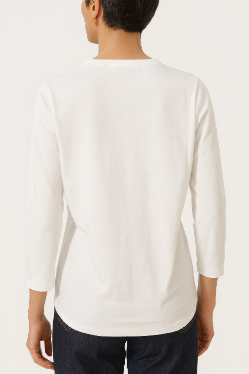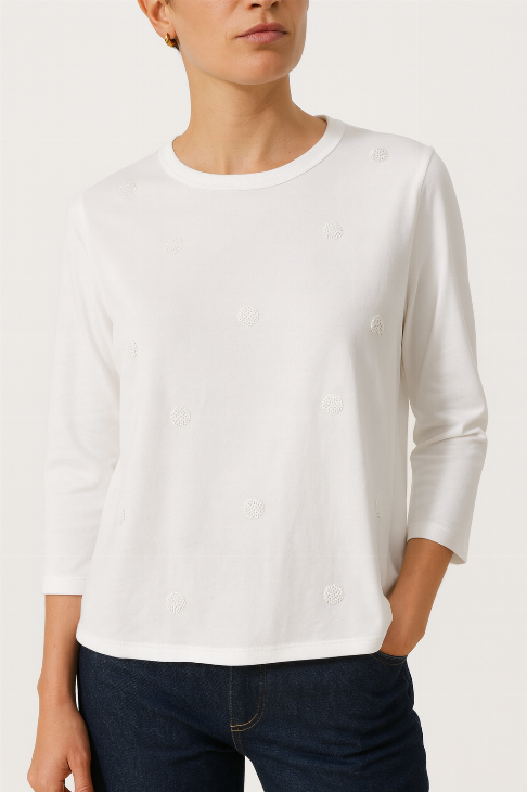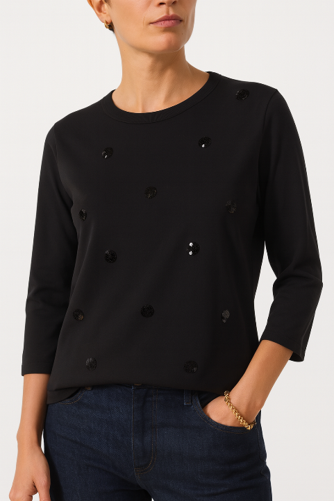 Radiating understated glamour, The Zara Sequin Top transforms a classic crew neckline into a statement of refined sparkle. Crafted, in our signature yarns, in classic Black or clean White, with sequins that catch the light with every movement. It's elegant 3/4 sleeves and tailored fit offer a sophisticated silhouette perfect for evening affairs or elevated daywear. Pair it with sleek trousers or a flowing skirt to complete a look of timeless luxury and sophistication.