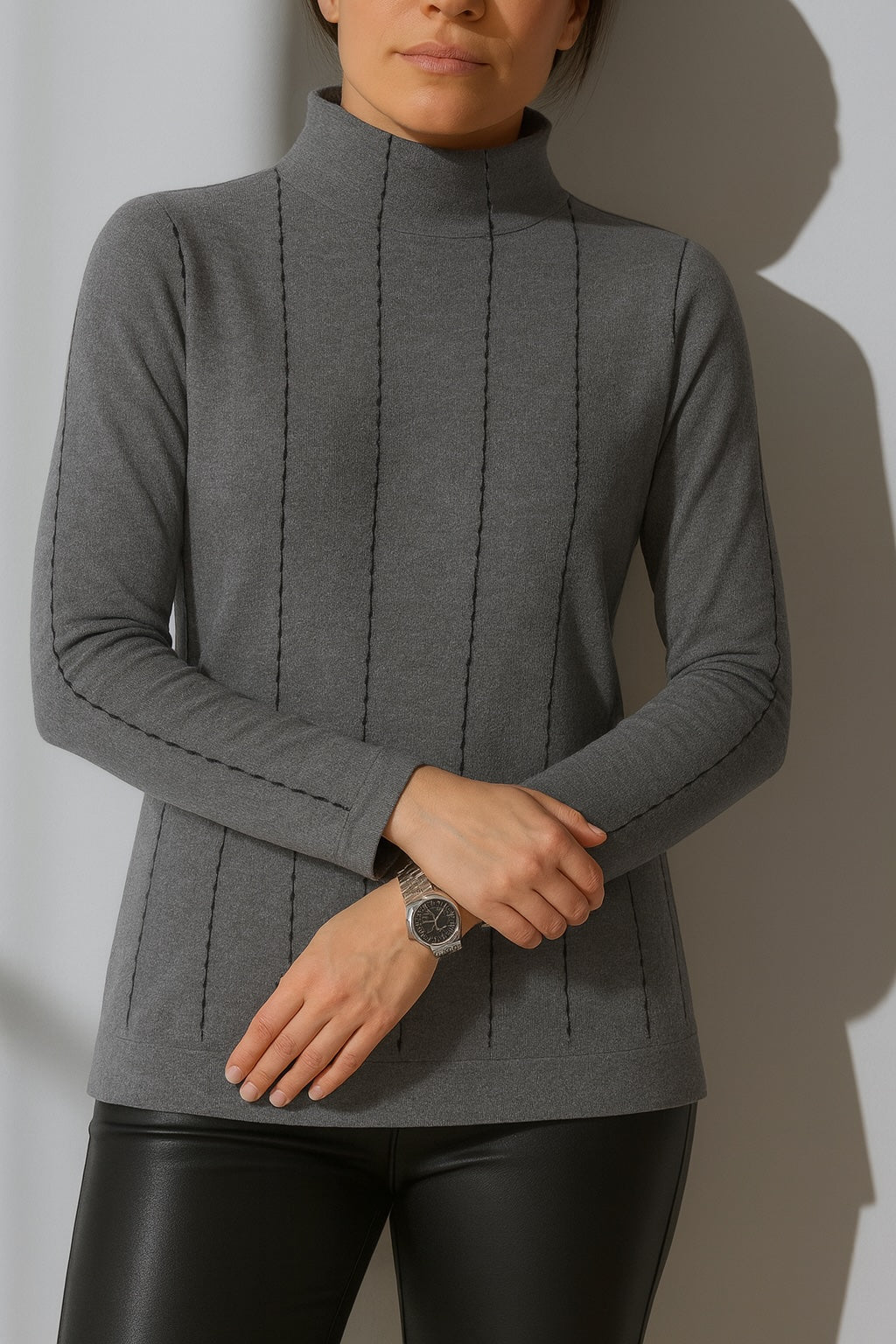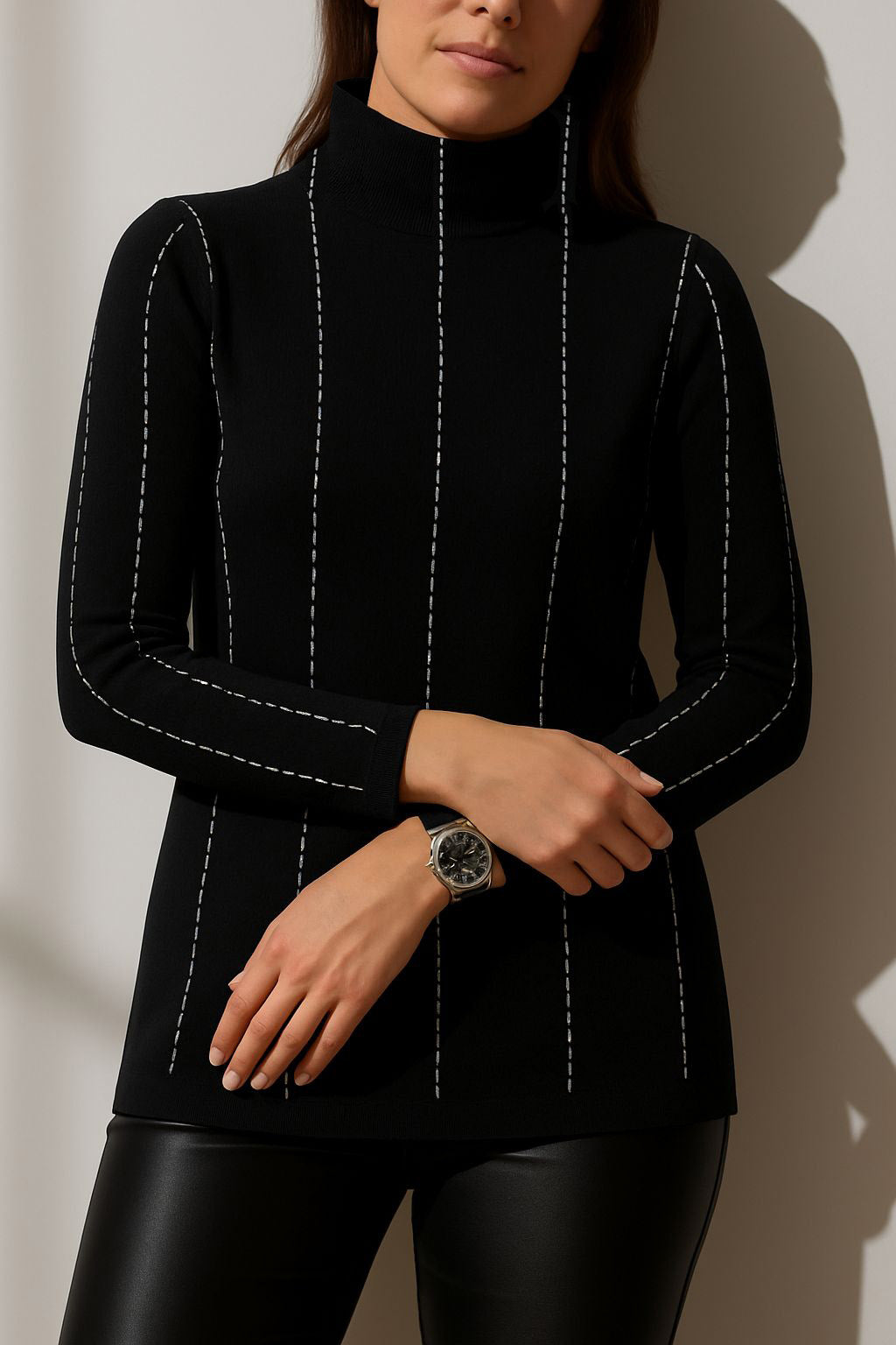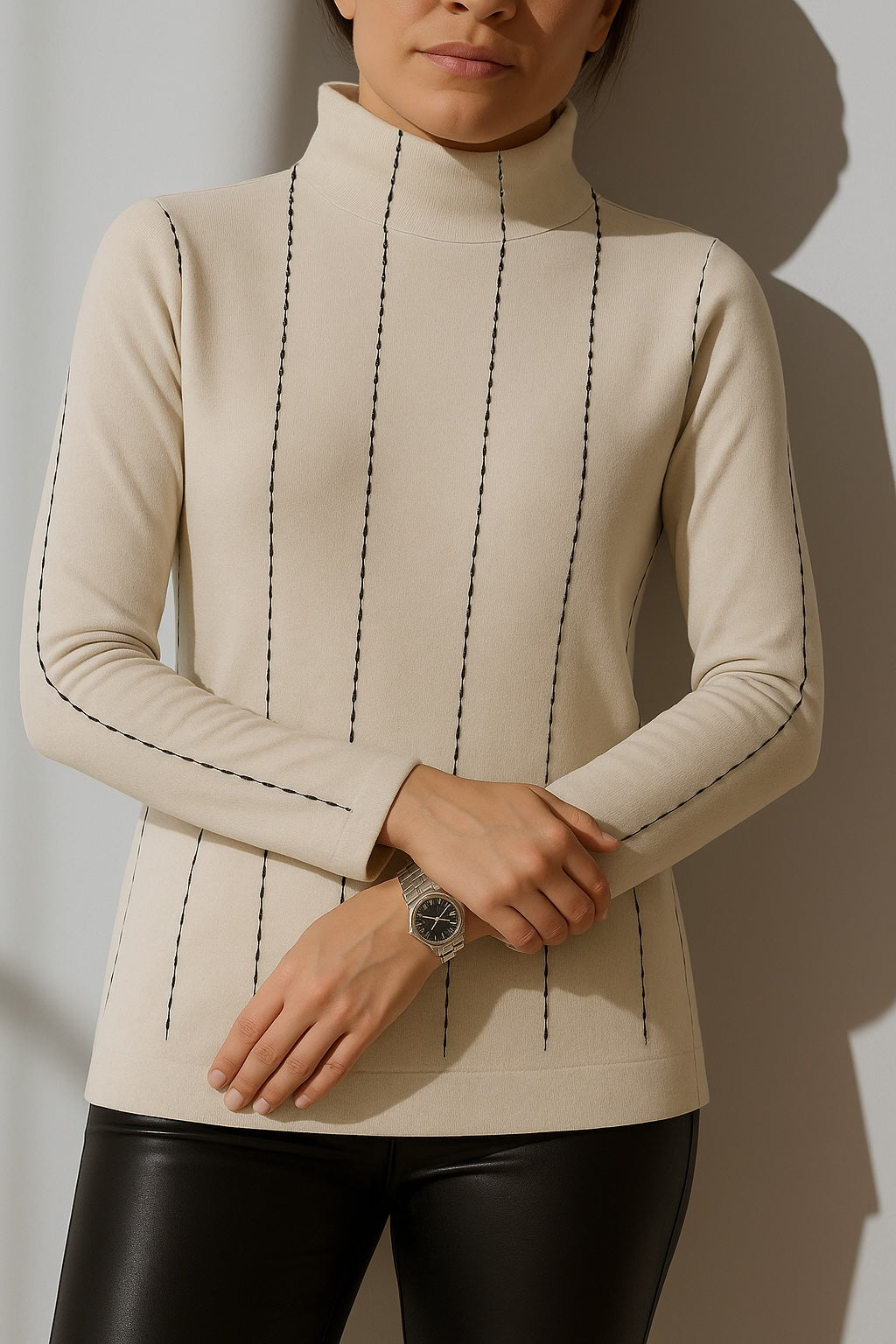 Knit in our Stolen Softness™️ Proprietary beloved yarn blend, The Nicosia Turtleneck Sweater is a study in subtlety and structure. Crafted with a sleek funnel neckline and defined by a delicate vertical novelty stitch, it shares a cozy, yet minimalistic style. The refined stripe print elongates the silhouette while offering a tailored softness that moves with you. Understated yet elevated, it's a modern essential with a distinctly polished edge. Perfect for snowy vacations or chilly mornings at a cafe. Cozy, sleek, and comfortable.