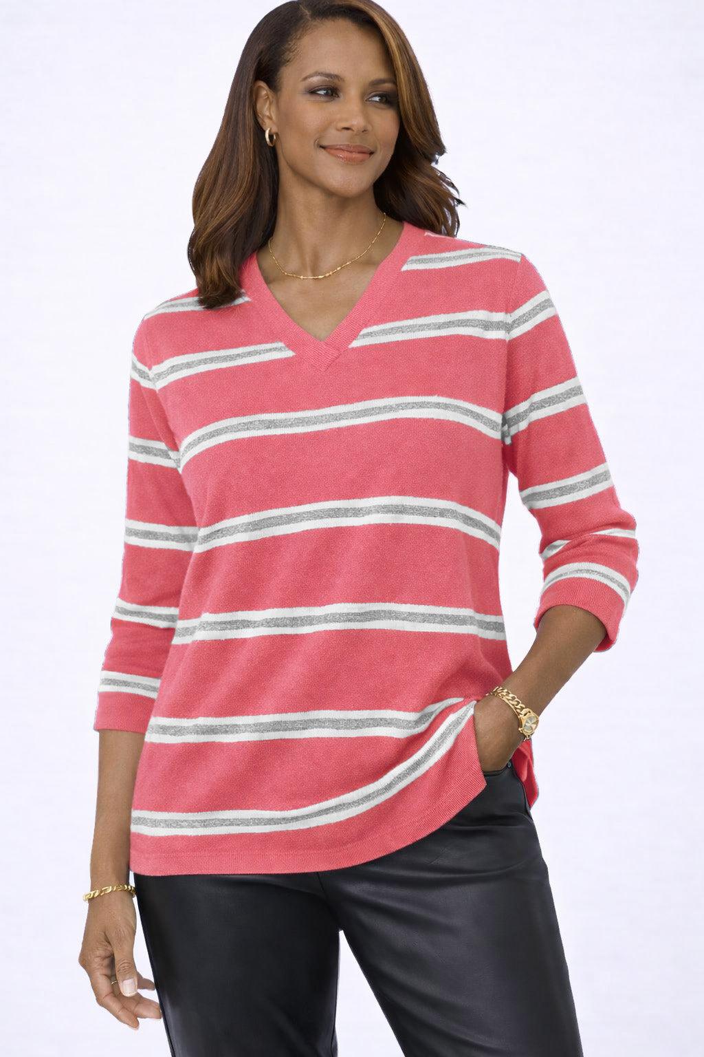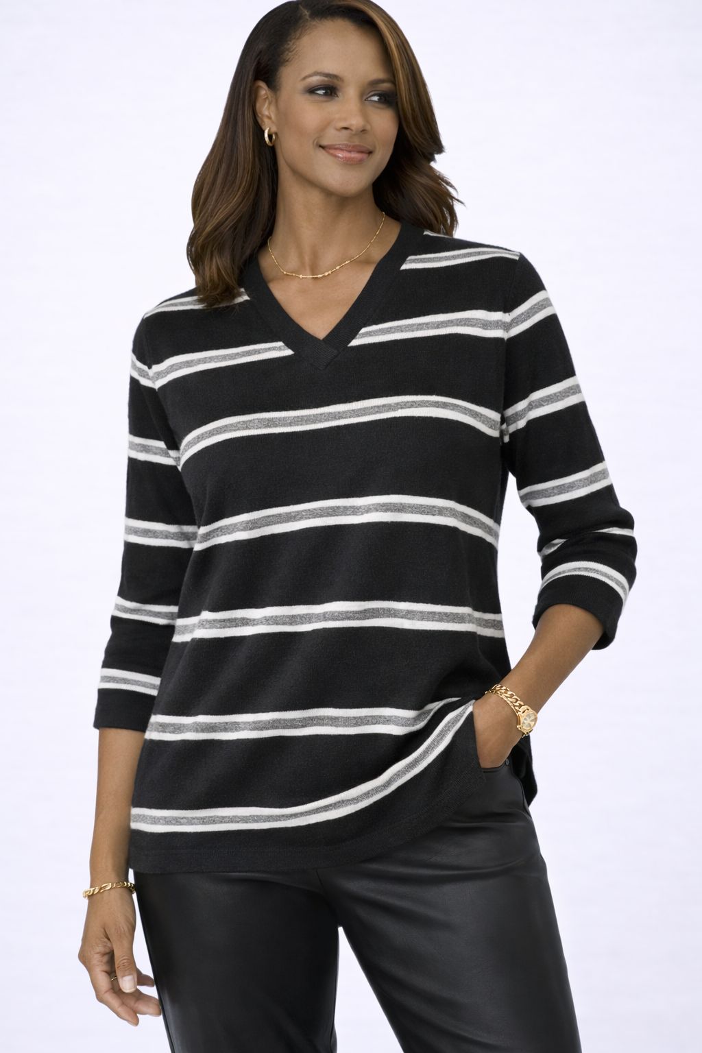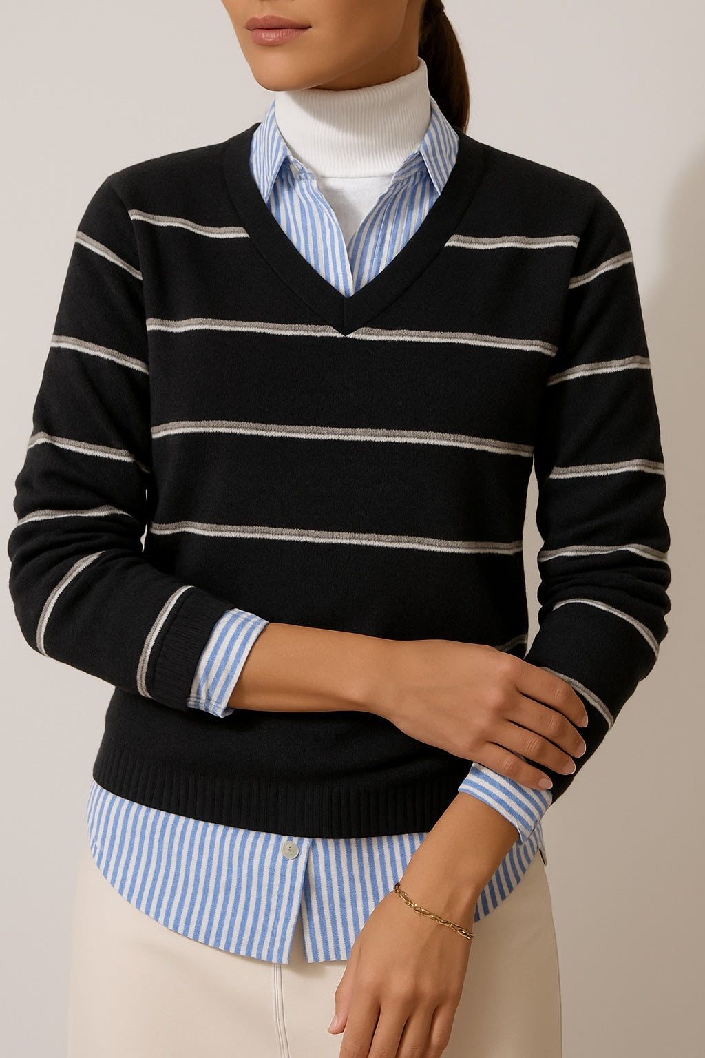 Made in our Stolen Softness™️ Proprietary beloved yarn blend, The Caleta Stripe Top is crafted in our lightweight knit for a soft feel. The flattering V-neckline and ¾ sleeves lend an easy elegance, while horizontal stripes add a hint of nautical polish. Designed with a relaxed yet refined fit, it's a go-to for strolls on the beach, getaways, or everyday ease—effortlessly pairing with crisp white denim or flowing skirts.