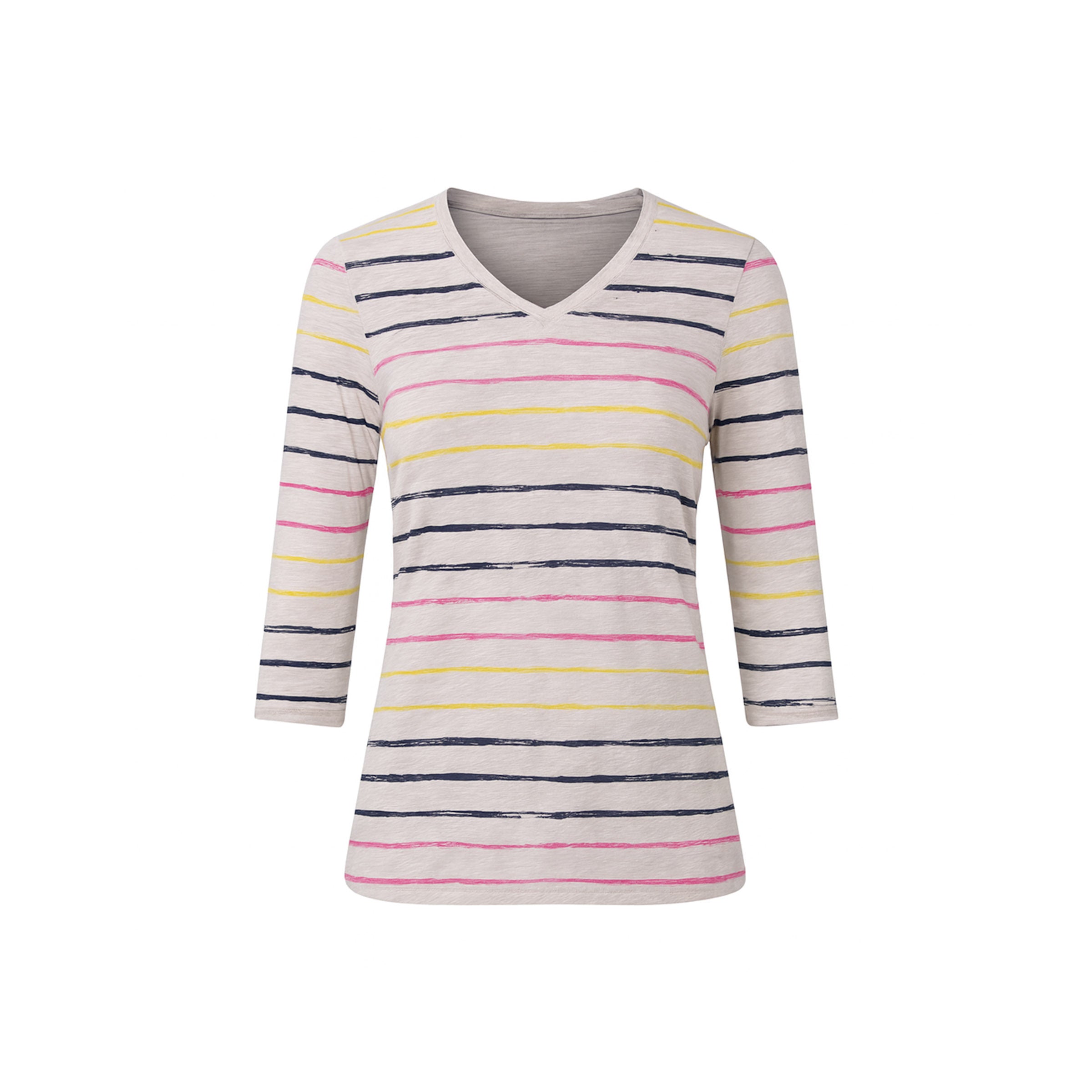 Made in our yarn blend, The Ithaca Striped V-Neck is features a clean V-neckline and elbow-length sleeves, it's elevated with a subtle arm pocket—blending utility with style. The relaxed fit and minimalist shape offer all-day comfort, while its thoughtful details keep it polished. Ideally paired with linens or denim, for days that start on the go and end by the water. A vibrant and playful take on a simple style.