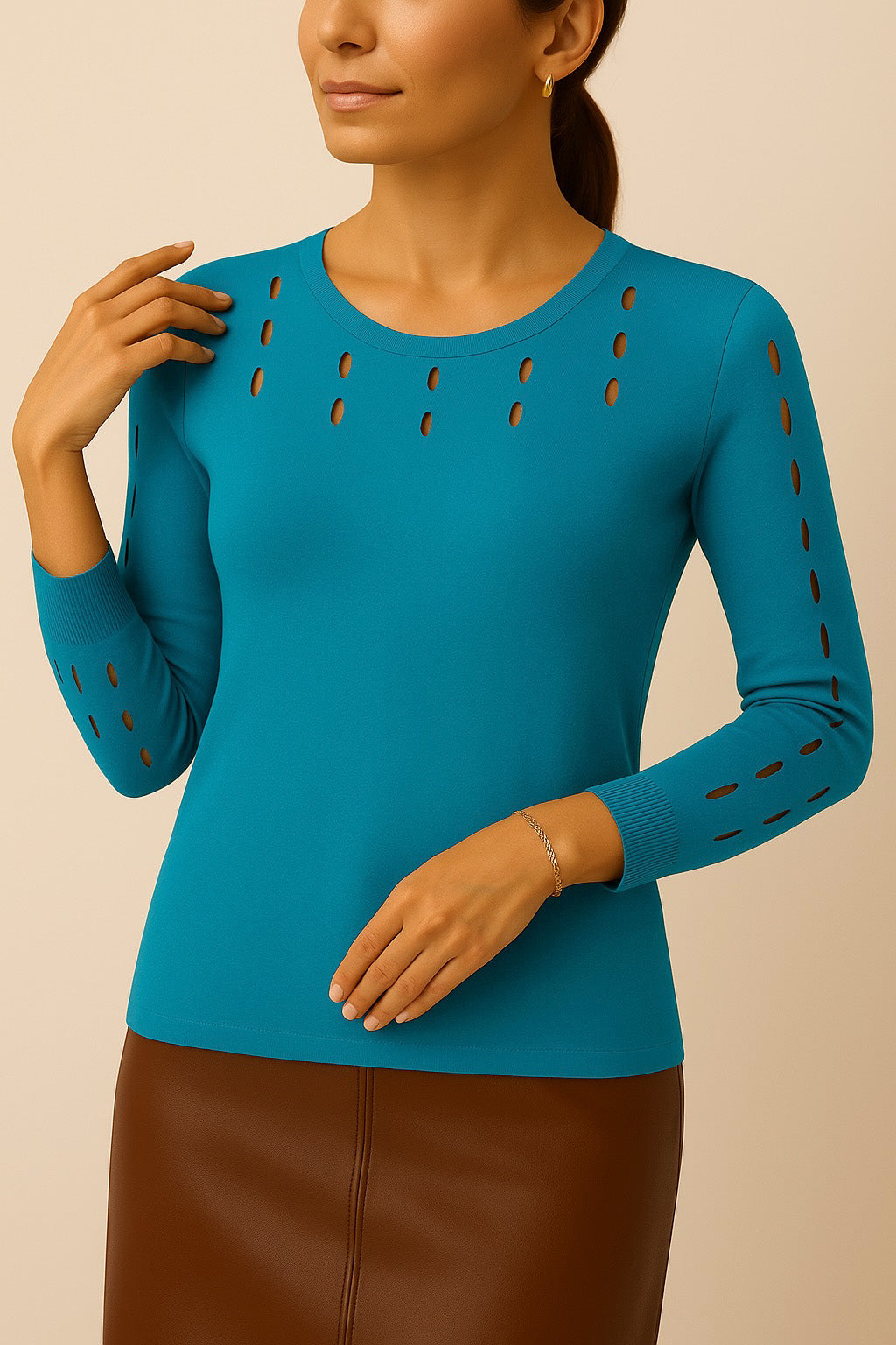 Crafted in our Stolen Softness™️ Proprietary beloved yarn blend, the Caserta Cut-out Top is sleek, structured, and subtly daring. Crafted in a refined, close-to-body silhouette, this long sleeve features a repeating cutout print that adds depth and intrigue while maintaining a clean, modern edge. Designed to sculpt and breathe, it's the perfect blend of art and intention—made for days that start with confidence and nights that echo style. Edgy, chic, and perfectly paired with denim or trousers -- for casual afternoons and nightly events.