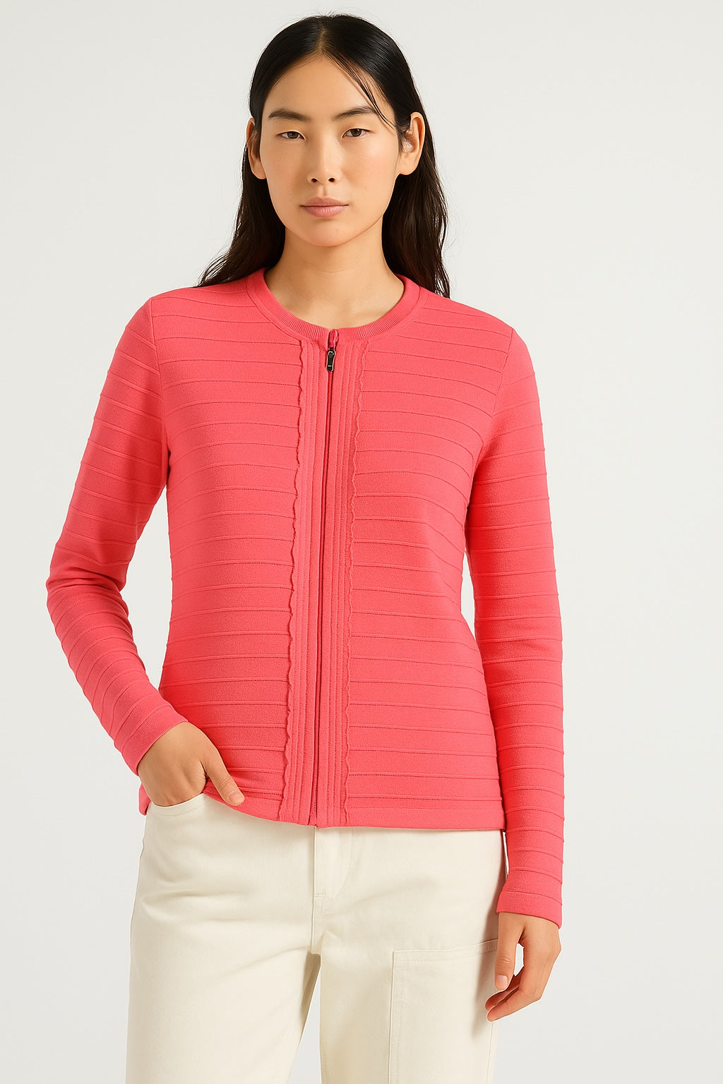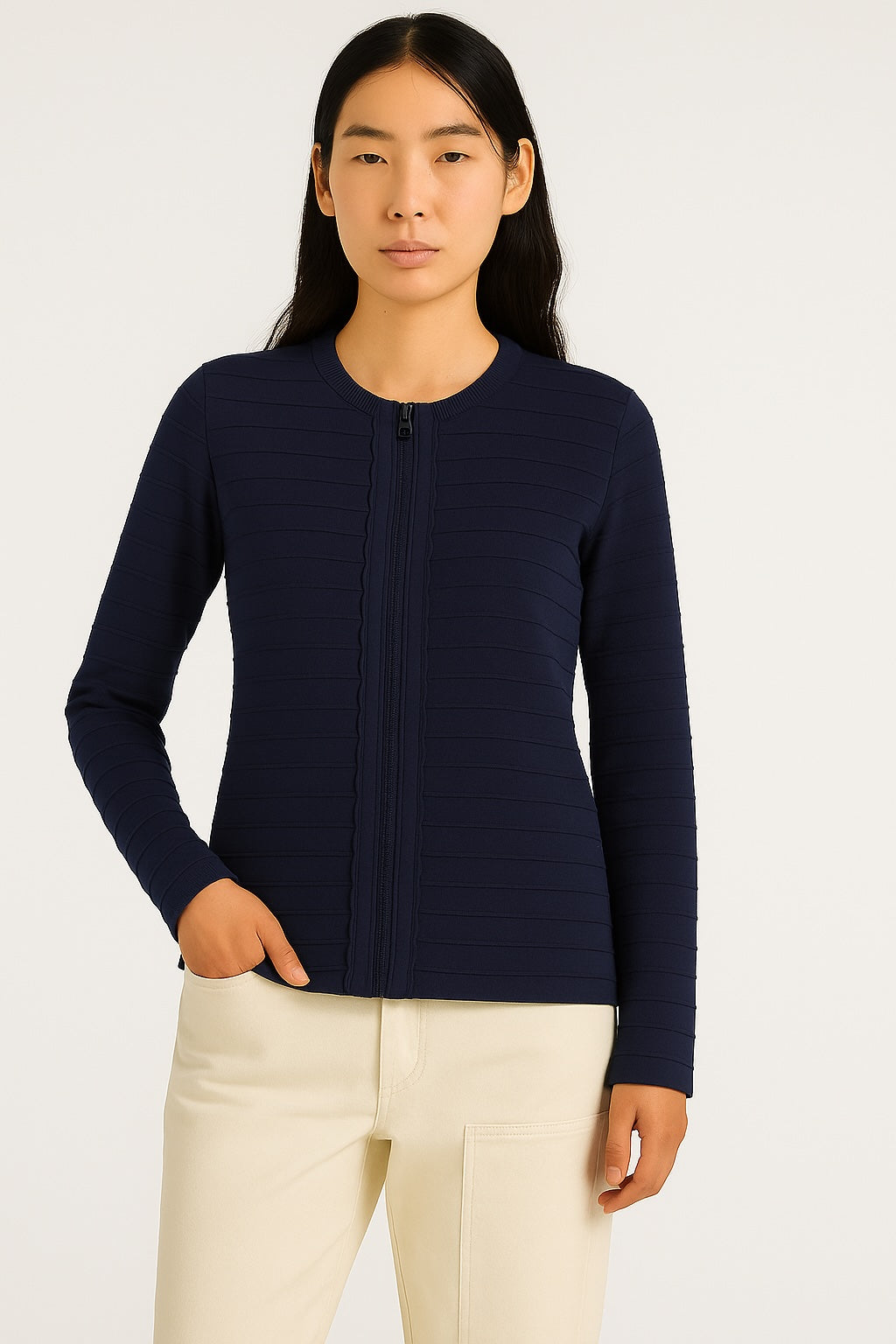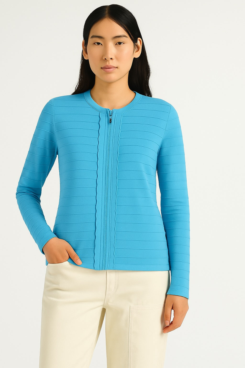 With its textured finish and expressive fringe details, The Chania Fringe Jacket brings a bold coastal spirit to classic tailoring. Designed in our Stolen Softness™️ Proprietary beloved yarn blend, this piece makes a statement through movement and dimension—thanks to its horizontal stripe texture. It's complete with a center front zipper closure, decorated with a fringe trim. Whether worn over crisp shirting or a simple knit, the jacket adds instant personality and polish. Effortlessly striking, it's a modern layer perfect for breezy strolls on the pier. A vibrant, playful take on a refined style.
